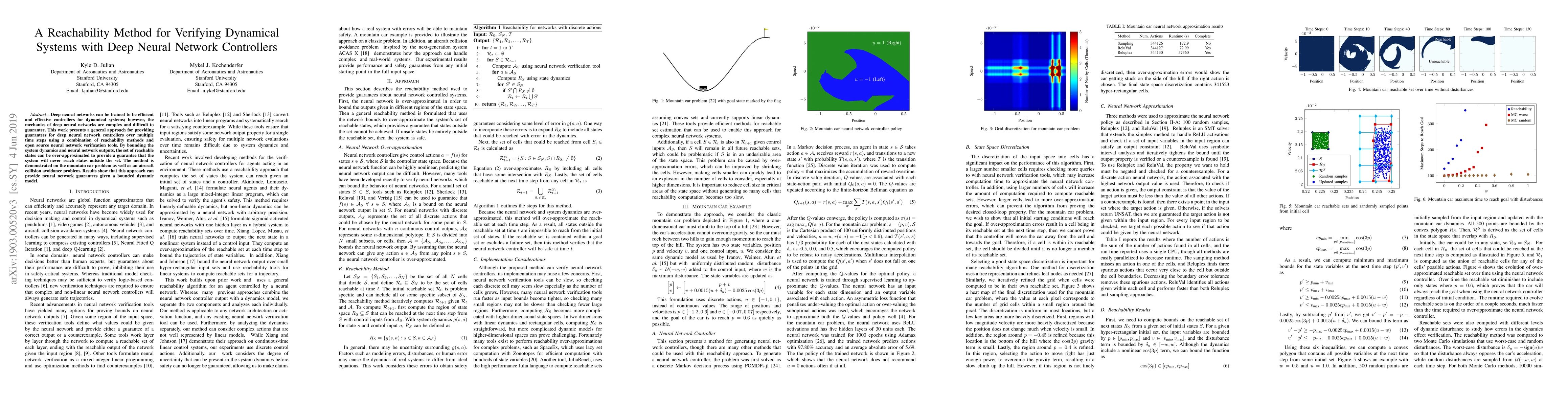 This paper proposes a method combining reachability analysis and neural network verification tools to provide guarantees for deep neural network controllers in dynamical systems. Demonstrated on the mountain car and aircraft collision avoidance problems, the approach bounds system dynamics and neural network outputs to ensure the system remains within safe states.