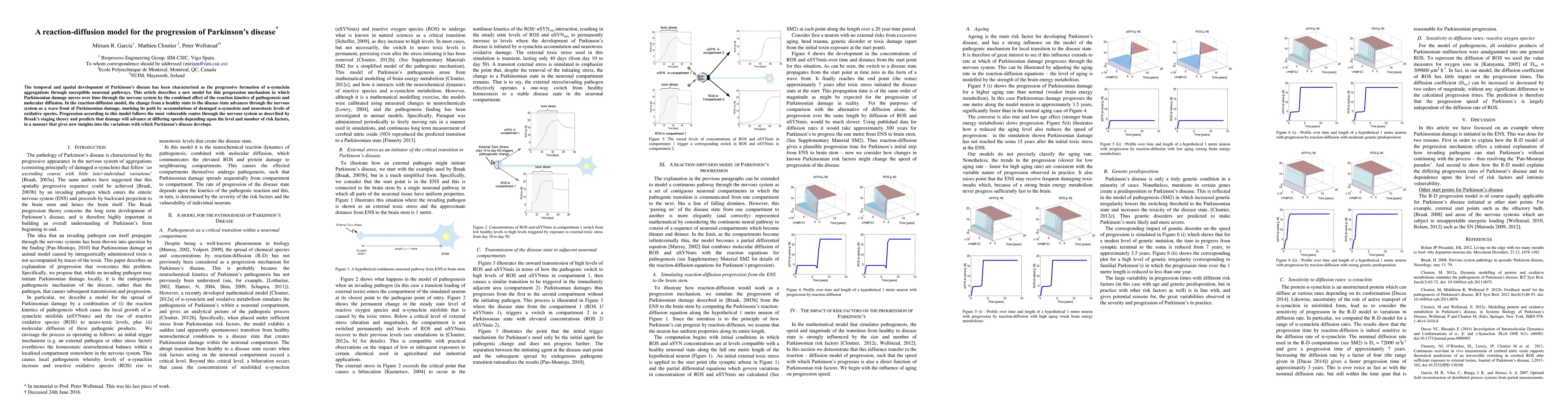 This paper introduces a reaction-diffusion model to describe the progression of Parkinson's disease, characterized by the spread of α-synuclein aggregations through neuronal pathways. The model predicts disease advancement as a wave front, influenced by reaction kinetics and molecular diffusion, aligning with Braak's staging theory and risk factors.