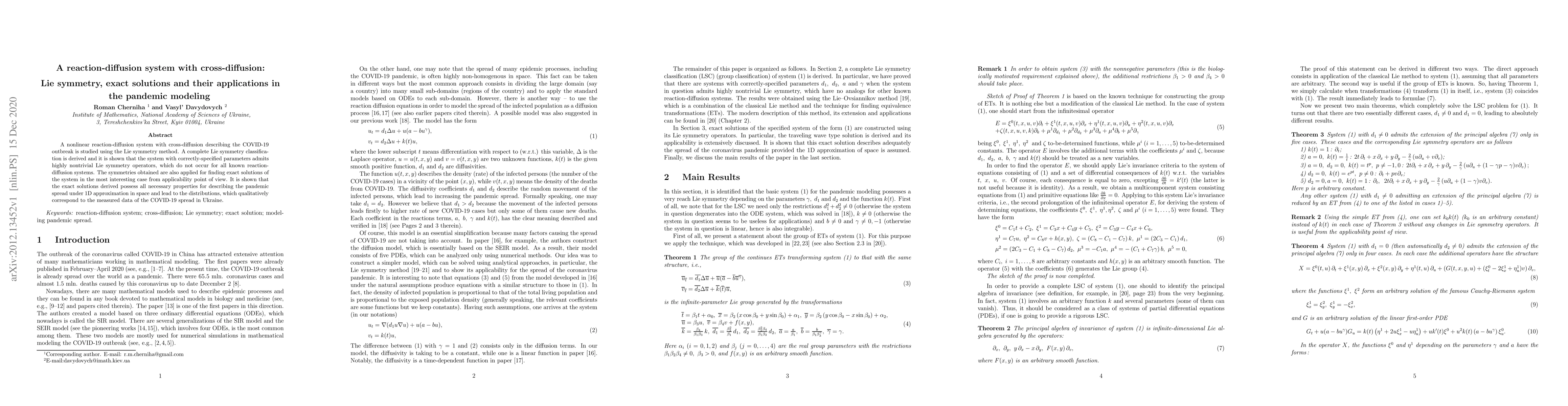 This paper studies a nonlinear reaction-diffusion system with cross-diffusion using the Lie symmetry method to model COVID-19 spread. It identifies unique Lie symmetry operators and derives exact solutions that accurately describe the pandemic spread in Ukraine, aligning with measured data.