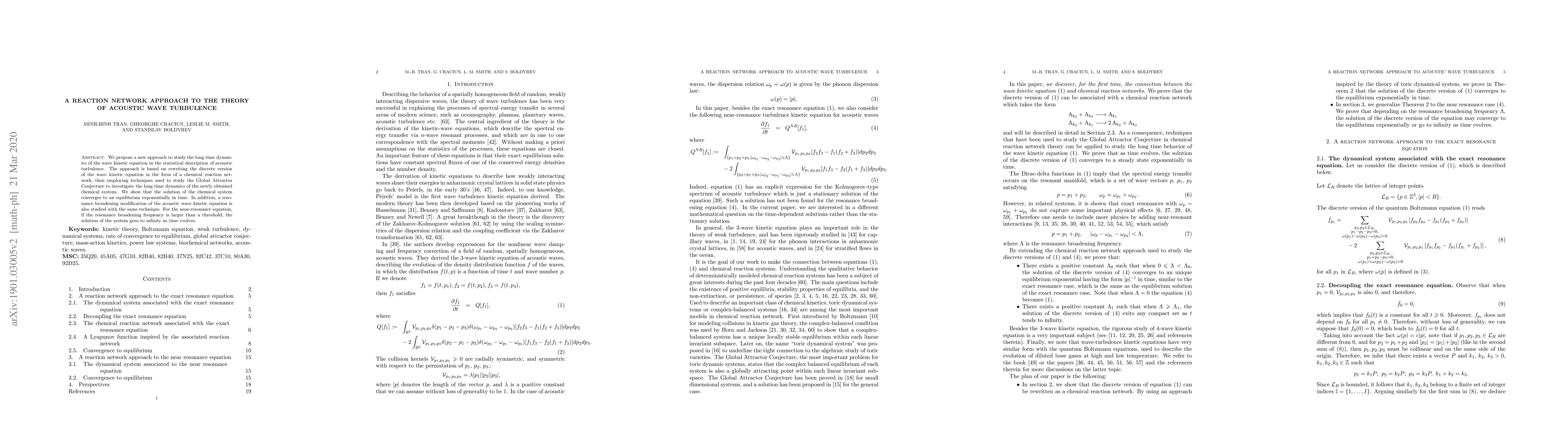 We propose a new approach to study the long time dynamics of the wave kinetic equation in the statistical description of acoustic turbulence. The approach is based on rewriting the discrete version of the wave kinetic equation in the form of a chemical reaction network, then employing techniques used to study the Global Attractor Conjecture to investigate the long time dynamics of the newly obtained chemical system. We show that the solution of the chemical system converges to an equilibrium exponentially in time. In addition, a resonance broadening modification of the acoustic wave kinetic equation is also studied with the same technique. For the near-resonance equation, if the resonance broadening frequency is larger than a threshold, the solution of the system goes to infinity as time evolves.