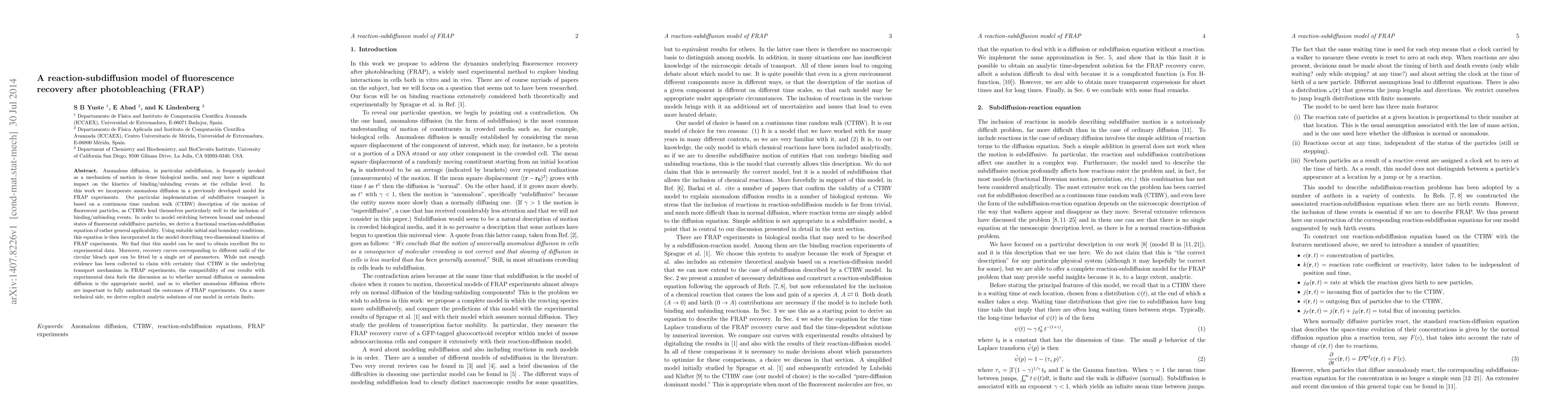 This paper develops a reaction-subdiffusion model for fluorescence recovery after photobleaching (FRAP) experiments, incorporating anomalous subdiffusion via a continuous time random walk. The model provides excellent fits to experimental data, suggesting anomalous diffusion may play a significant role in understanding FRAP outcomes.