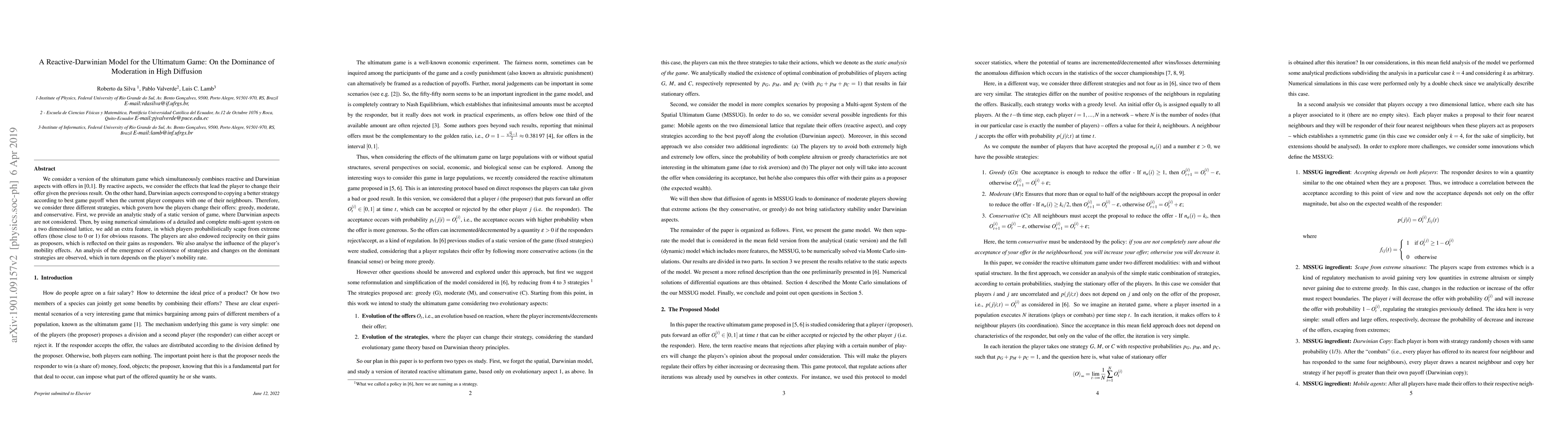 This paper explores a reactive-Darwinian model for the ultimatum game, analyzing the dominance of moderate strategies over greedy and conservative ones in high diffusion scenarios. Numerical simulations reveal that moderate strategies prevail due to players' tendency to avoid extreme offers and their mobility effects.