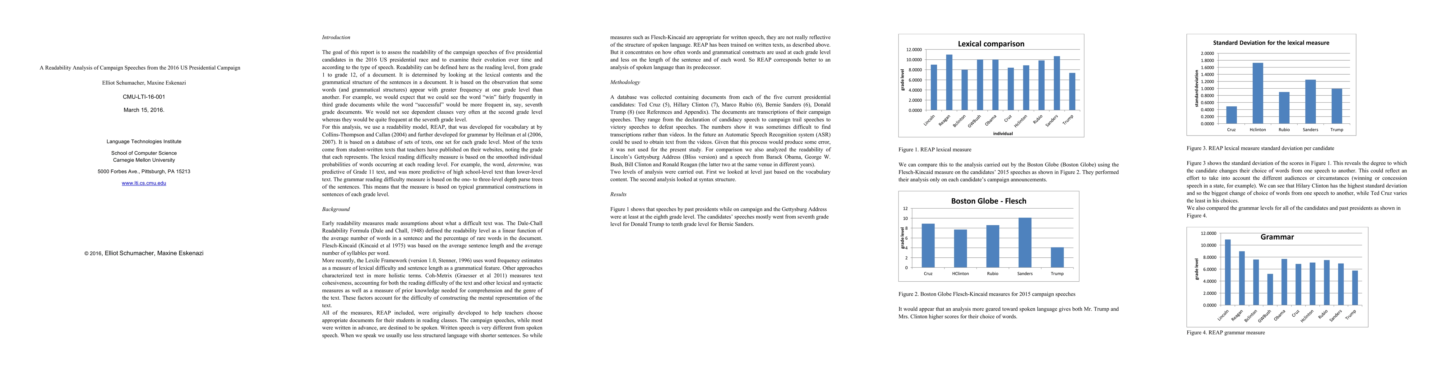 Readability is defined as the reading level of the speech from grade 1 to grade 12. It results from the use of the REAP readability analysis (vocabulary - Collins-Thompson and Callan, 2004; syntax - Heilman et al ,2006, 2007), which use the lexical contents and grammatical structure of the sentences in a document to predict the reading level. After analysis, results were grouped into the average readability of each candidate, the evolution of the candidate's speeches' readability over time and the standard deviation, or how much each candidate varied their speech from one venue to another. For comparison, one speech from four past presidents and the Gettysburg Address were also analyzed.