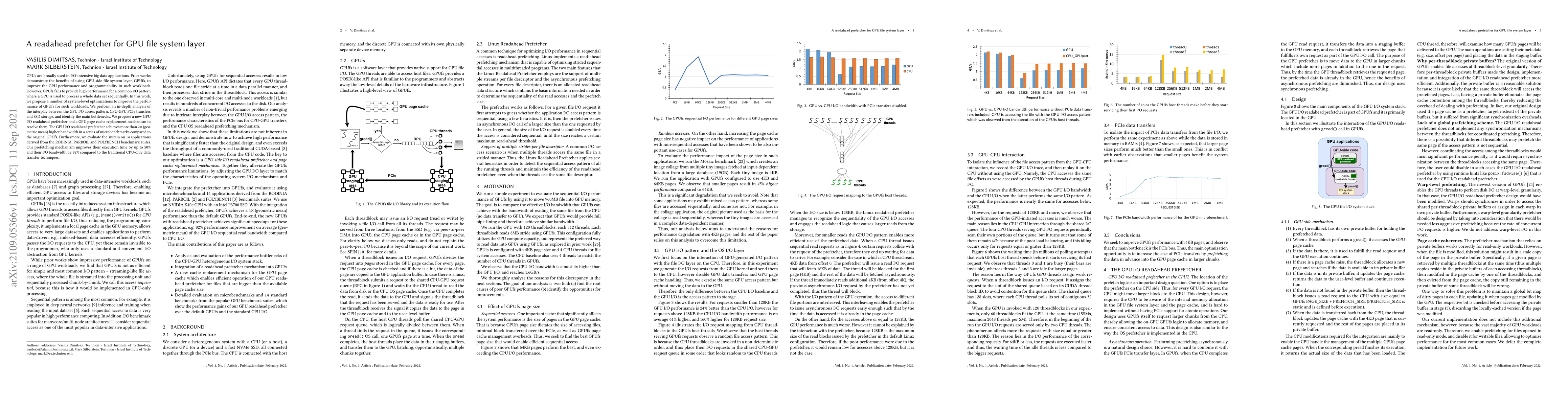 This paper proposes system-level optimizations to enhance the performance of GPUfs for sequential I/O workloads, introducing a GPU I/O readahead prefetcher and a GPU page cache mechanism that achieve over 2x higher bandwidth and up to 50% faster execution times in tested applications compared to traditional CPU-only data transfer methods.
