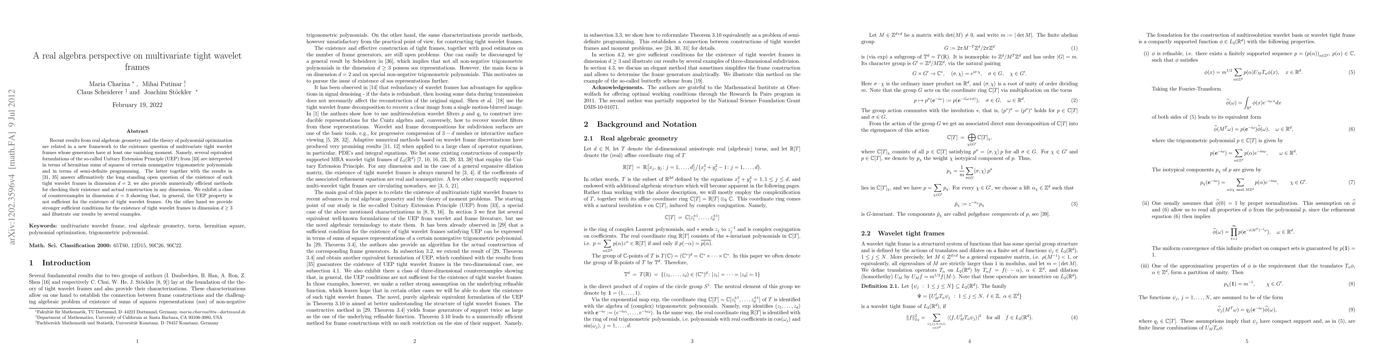 This work provides a novel approach to construct multivariate tight wavelet frames, which are crucial in signal processing and data compression, by connecting polynomial optimization and real algebraic geometry.