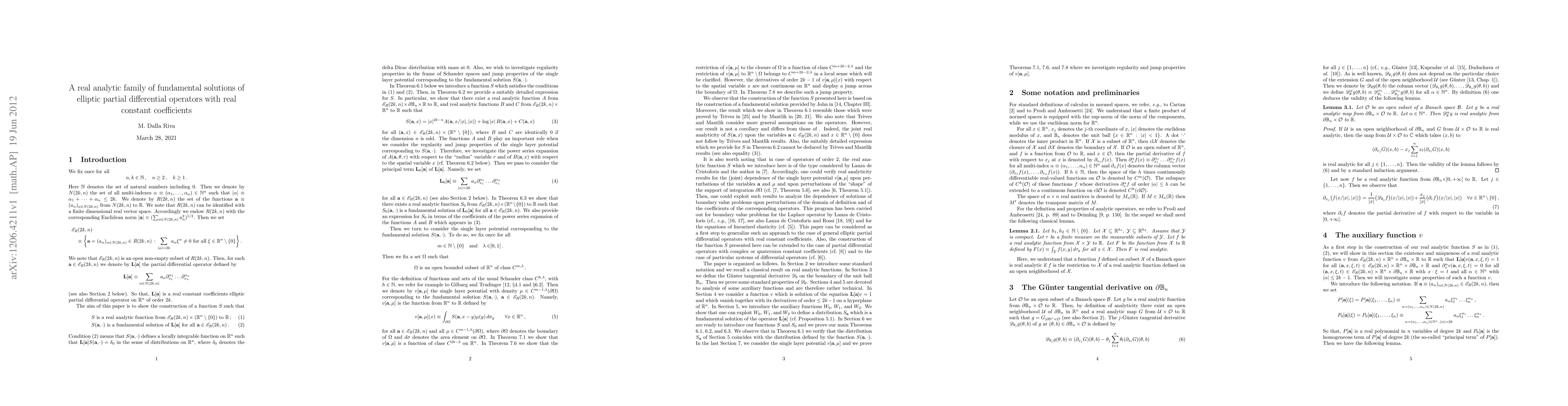 This paper constructs a real analytic family of fundamental solutions for elliptic partial differential operators with real constant coefficients, expressed as jointly real analytic functions of operator coefficients and spatial variables, demonstrating regularity in Schauder spaces for single layer potentials.