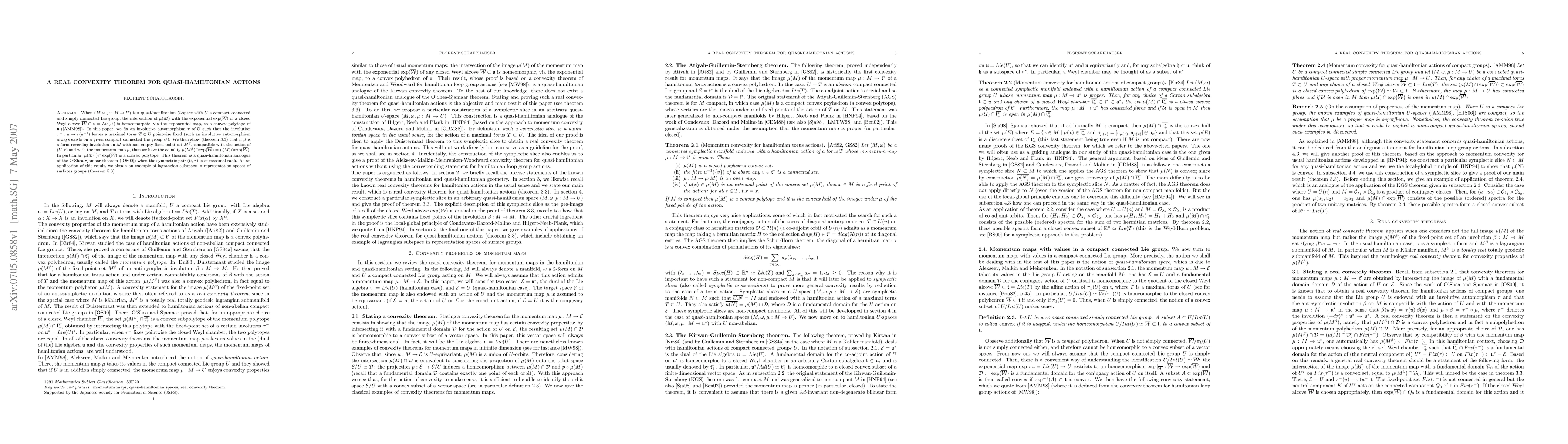 The main result of this paper is a quasi-hamiltonian analogue of a special case of the O'Shea-Sjamaar convexity theorem for usual momentum maps. We denote by U a simply connected compact connected Lie group and we fix an involutive automorphism of maximal rank on this Lie group (such an automorphism always exists). We then denote by M a quasi-hamiltonian U-space and we prove that the image under the momentum map of the fixed-point set of a form-reversing compatible involution of M is a convex polytope, which is in fact equal to the full momentum polytope. This theorem was announced in arXiv:math/0609517v1. As an application, we obtain an example of lagrangian subspace in representation spaces of surface groups.