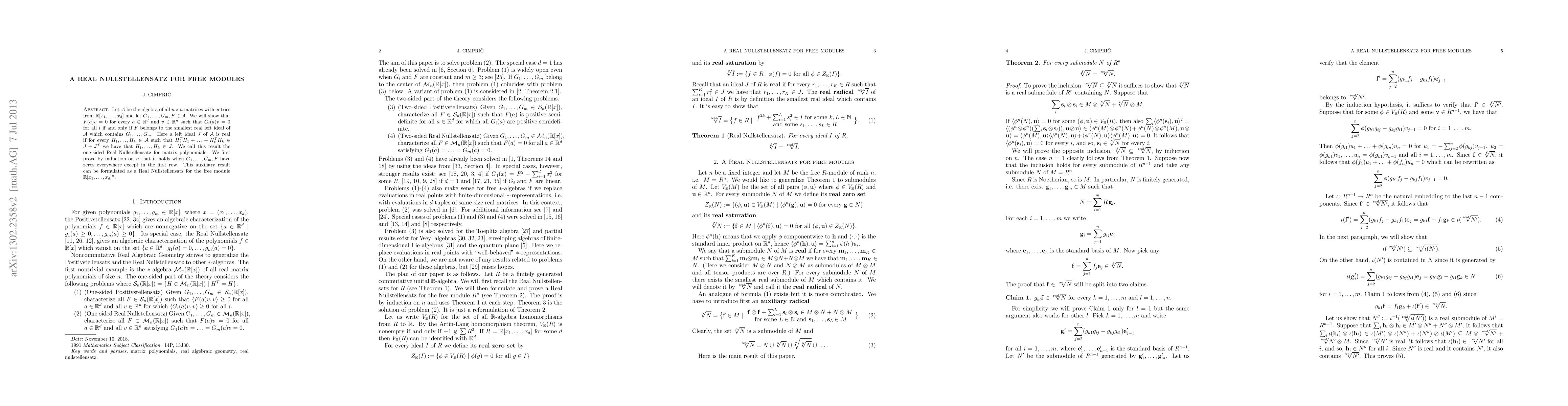 Let $A$ be the algebra of all $n \times n$ matrices with entries from $\RR[x_1,\ldots,x_d]$ and let $G_1,\ldots,G_m,F \in A$. We will show that $F(a)v=0$ for every $a \in \RR^d$ and $v \in \RR^n$ such that $G_i(a)v=0$ for all $i$ if and only if $F$ belongs to the smallest real left ideal of $A$ which contains $G_1,\ldots,G_m$. Here a left ideal $J$ of $A$ is real if for every $H_1,\ldots,H_k \in A$ such that $H_1^T H_1+\ldots+H_k^T H_k \in J+J^T$ we have that $H_1,\ldots,H_k \in J$. We call this result the one-sided Real Nullstellensatz for matrix polynomials. We first prove by induction on $n$ that it holds when $G_1,\ldots,G_m,F$ have zeros everywhere except in the first row. This auxiliary result can be formulated as a Real Nullstellensatz for the free module $\RR[x_1,\ldots,x_d]^n$.
