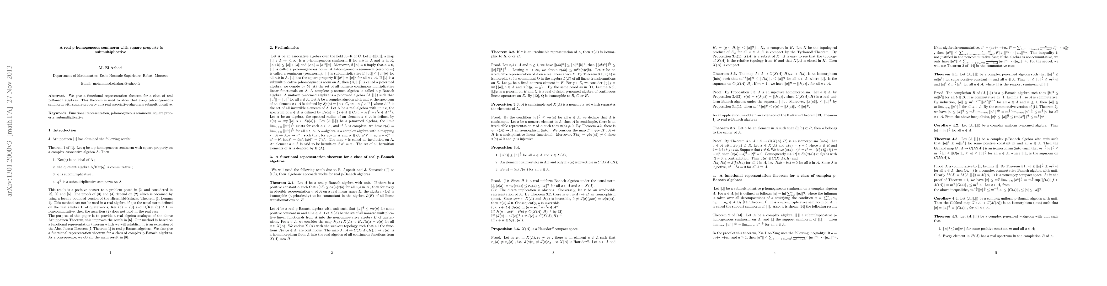 A new theorem proves that p-homogeneous seminorms with square property on real associative algebras are submultiplicative, offering insights into functional representations of p-Banach algebras.