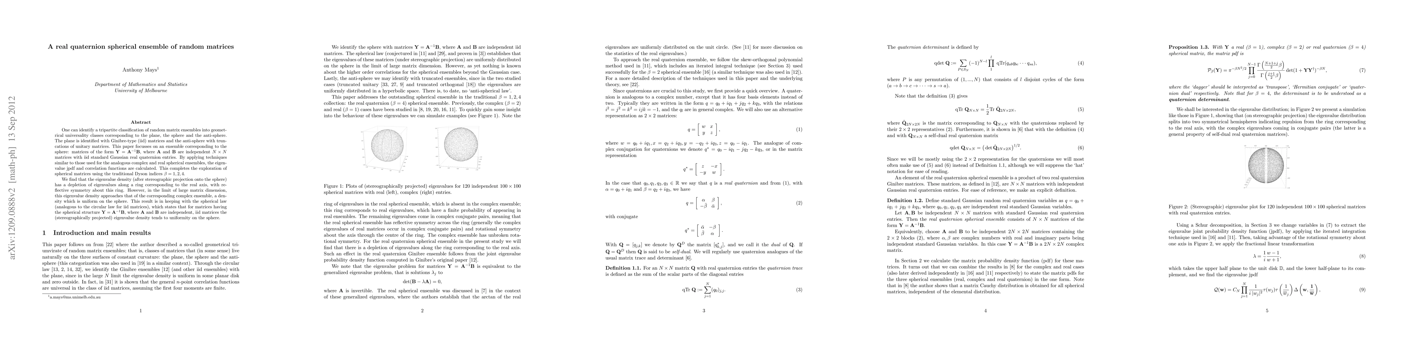 This paper explores a real quaternion spherical ensemble of random matrices, deriving the joint probability density function (jpdf) and correlation functions. It finds that the eigenvalue density, after stereographic projection, exhibits a depletion along the real axis but approaches uniformity on the sphere in the large matrix dimension limit, consistent with the spherical law.
