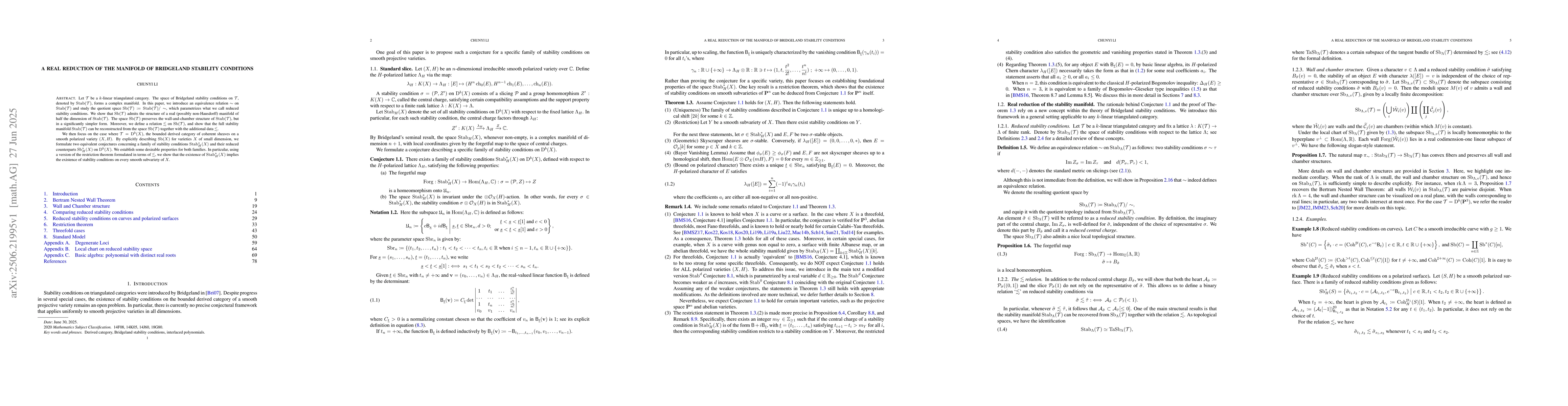 Let $\mathcal{T}$ be a $k$-linear triangulated category. The space of Bridgeland stability conditions on $\mathcal{T}$, denoted by $\mathrm{Stab}(\mathcal{T})$, forms a complex manifold. In this paper, we introduce an equivalence relation $\sim$ on $\mathrm{Stab}(\mathcal{T})$ and study the quotient space $\mathrm{Sb}(\mathcal{T}) := \mathrm{Stab}(\mathcal{T})/\sim$, which parametrizes what we call reduced stability conditions. We show that $\mathrm{Sb}(\mathcal{T})$ admits the structure of a real (possibly non-Hausdorff) manifold of half the dimension of $\mathrm{Stab}(\mathcal{T})$. The space $\mathrm{Sb}(\mathcal{T})$ preserves the wall-and-chamber structure of $\mathrm{Stab}(\mathcal{T})$, but in a significantly simpler form. Moreover, we define a relation $\lesssim$ on $\mathrm{Sb}(\mathcal{T})$, and show that the full stability manifold $\mathrm{Stab}(\mathcal{T})$ can be reconstructed from the space $\mathrm{Sb}(\mathcal{T})$ together with the additional data $\lesssim$. We then focus on the case where $\mathcal{T} = \mathrm{D}^b(X)$, the bounded derived category of coherent sheaves on a smooth polarized variety $(X, H)$. By explicitly describing $\mathrm{Sb}(X)$ for varieties $X$ of small dimension, we formulate two equivalent conjectures concerning a family of stability conditions $\mathrm{Stab}_H^*(X)$ and their reduced counterparts $\mathrm{Sb}_H^*(X)$ on $\mathrm{D}^b(X)$. We establish some desirable properties for both families. In particular, using a version of the restriction theorem formulated in terms of $\lesssim$, we show that the existence of $\mathrm{Stab}_H^*(X)$ implies the existence of stability conditions on every smooth subvariety of $X$.