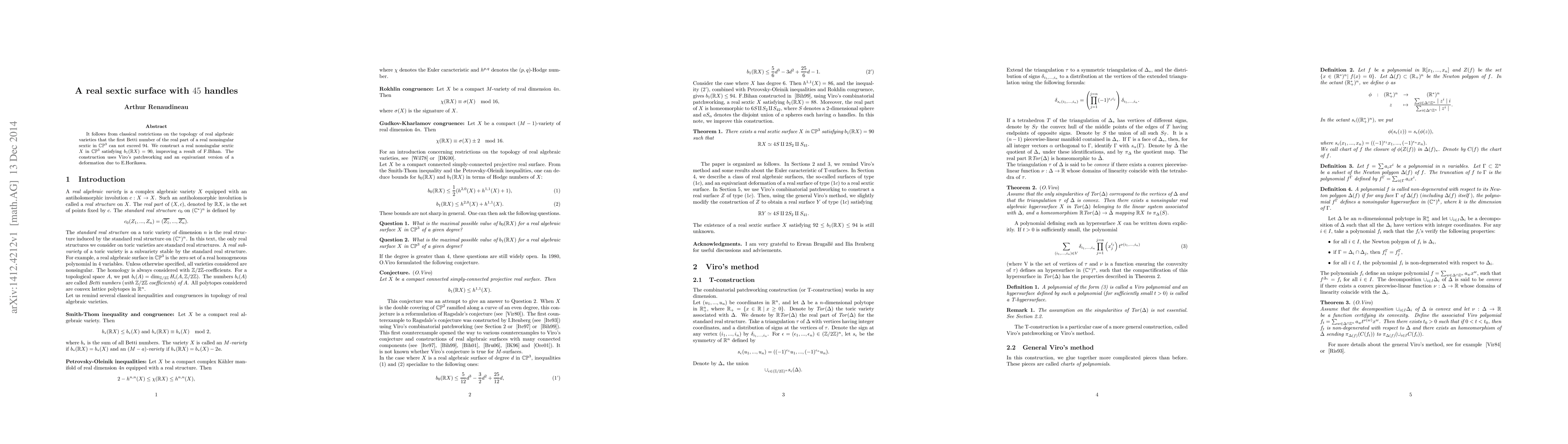 Researchers construct a real nonsingular sextic surface in $ ext{CP}^3$ with 45 handles, exceeding the previously known limit of $b_1( ext{R}X)=94$, using Viro's patchworking method.
