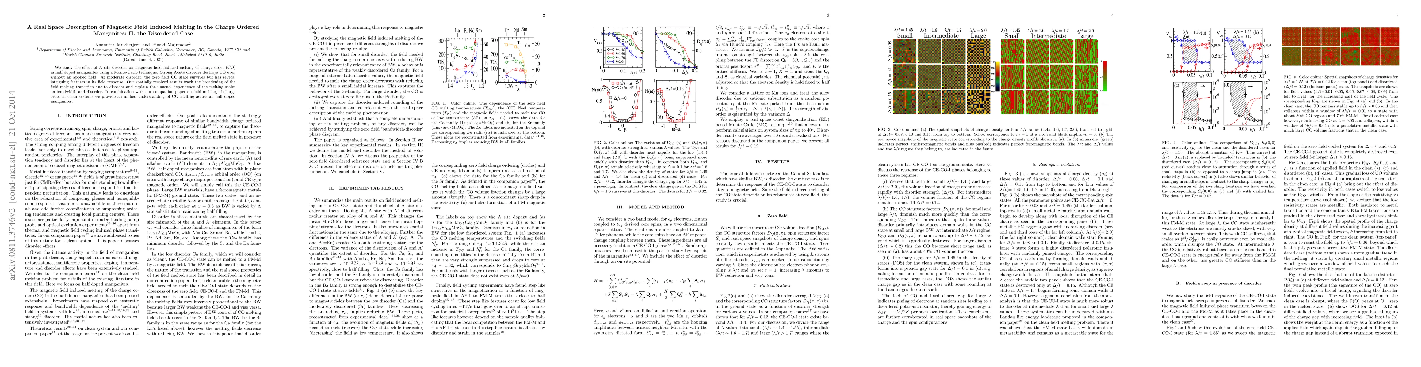 We study the effect of A site disorder on magnetic field induced melting of charge order (CO) in half doped manganites using a Monte-Carlo technique. Strong A-site disorder destroys CO even without an applied field. At moderate disorder, the zero field CO state survives but has several intriguing features in its field response. Our spatially resolved results track the broadening of the field melting transition due to disorder and explain the unusual dependence of the melting scales on bandwidth and disorder. In combination with our companion paper on field melting of charge order in clean systems we provide an unified understanding of CO melting across all half doped manganites.