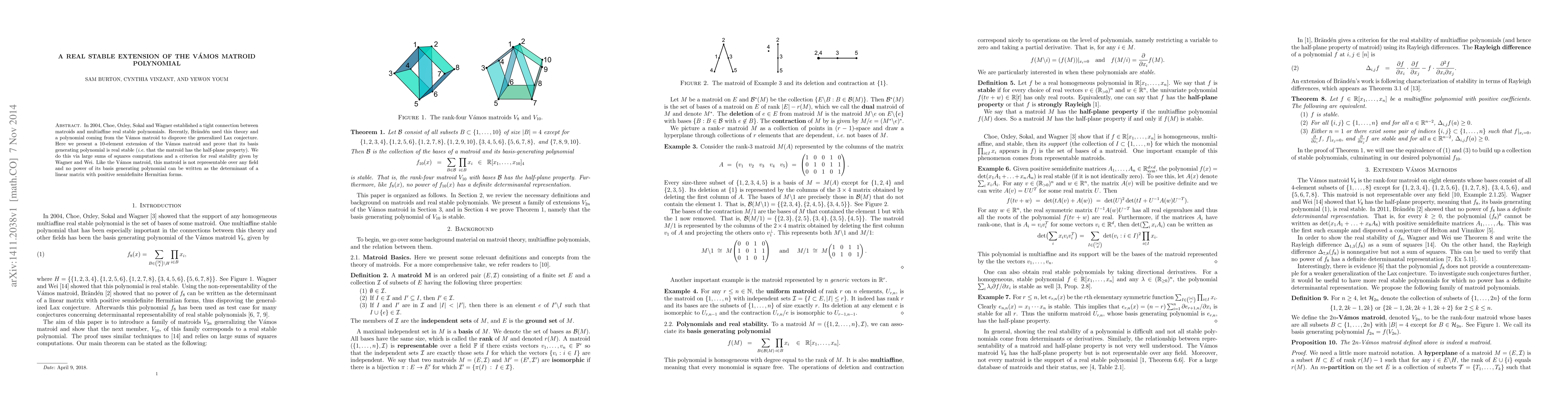 In 2004, Choe, Oxley, Sokal and Wagner established a tight connection between matroids and multiaffine real stable polynomials. Recently, Branden used this theory and a polynomial coming from the Vamos matroid to disprove the generalized Lax conjecture. Here we present a 10-element extension of the Vamos matroid and prove that its basis generating polynomial is real stable (i.e. that the matroid has the half-plane property). We do this via large sums of squares computations and a criterion for real stability given by Wagner and Wei. Like the Vamos matroid, this matroid is not representable over any field and no power of its basis generating polynomial can be written as the determinant of a linear matrix with positive semidefinite Hermitian forms.