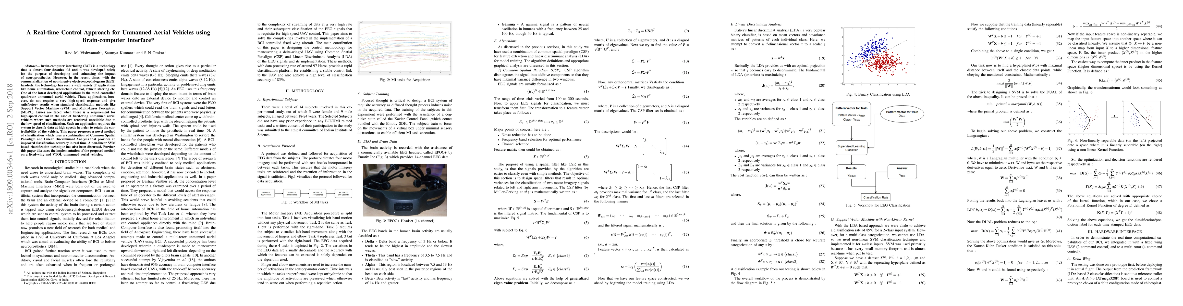 Brain-computer interfacing (BCI) is a technology that is almost four decades old and it was developed solely for the purpose of developing and enhancing the impact of neuroprosthetics. However, in the recent times, with the commercialization of non-invasive electroencephalogram (EEG) headsets, the technology has seen a wide variety of applications like home automation, wheelchair control, vehicle steering etc. One of the latest developed applications is the mind-controlled quadrotor unmanned aerial vehicle. These applications, how- ever, do not require a very high-speed response and give satisfactory results when standard classification methods like Support Vector Machine (SVM) and Multi-Layer Perceptron (MLPC). Issues are faced when there is a requirement for high-speed control in the case of fixed-wing unmanned aerial vehicles where such methods are rendered unreliable due to the low speed of classification. Such an application requires the system to classify data at high speeds in order to retain the con- trollability of the vehicle. This paper proposes a novel method of classification which uses a combination of Common Spatial Paradigm and Linear Discriminant Analysis that provides an improved classification accuracy in real time. A non-linear SVM based classification technique has also been discussed. Further, this paper discusses the implementation of the proposed method on a fixed-wing and VTOL unmanned aerial vehicles.