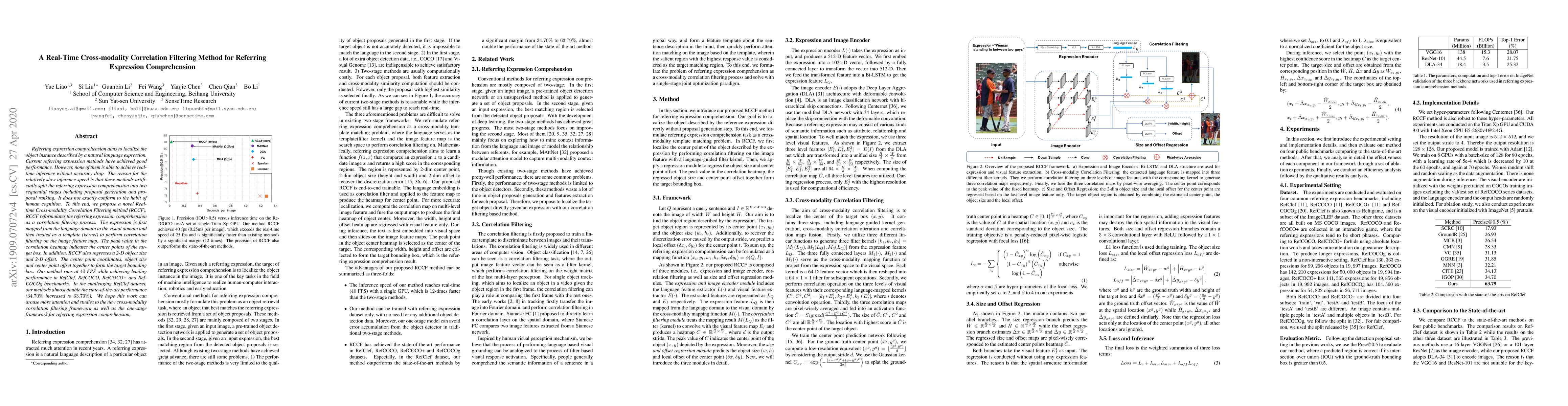 The paper proposes a novel Realtime Cross-modality Correlation Filtering method (RCCF) to enhance real-time referring expression comprehension, achieving 40 FPS while maintaining top performance across multiple benchmarks. RCCF reformulates comprehension as a correlation filtering process, directly mapping language to visual features, and outperforms existing two-stage methods.