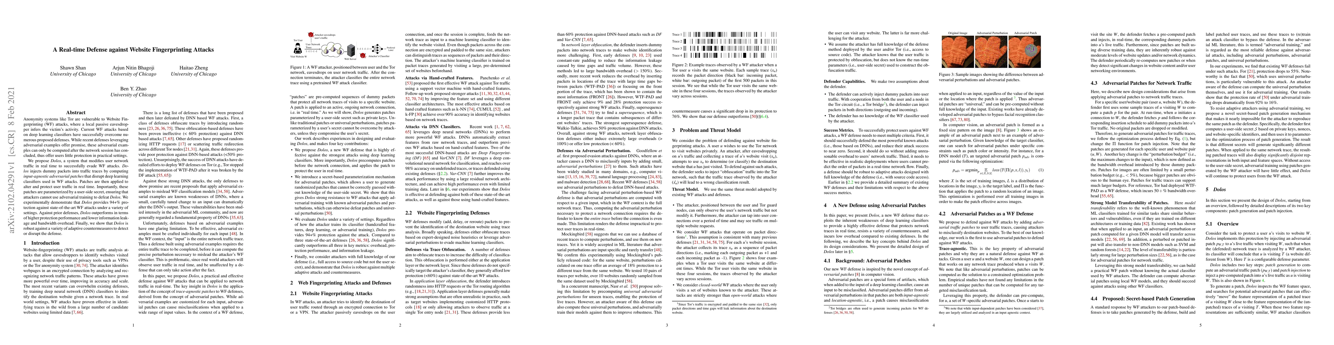 The paper proposes Dolos, a real-time system to defend against Website Fingerprinting attacks on anonymity systems like Tor, by injecting dummy packets to disrupt deep learning classifiers used in such attacks. Dolos provides high protection rates (over 94%) and outperforms prior defenses in terms of lower information leakage and bandwidth overhead.