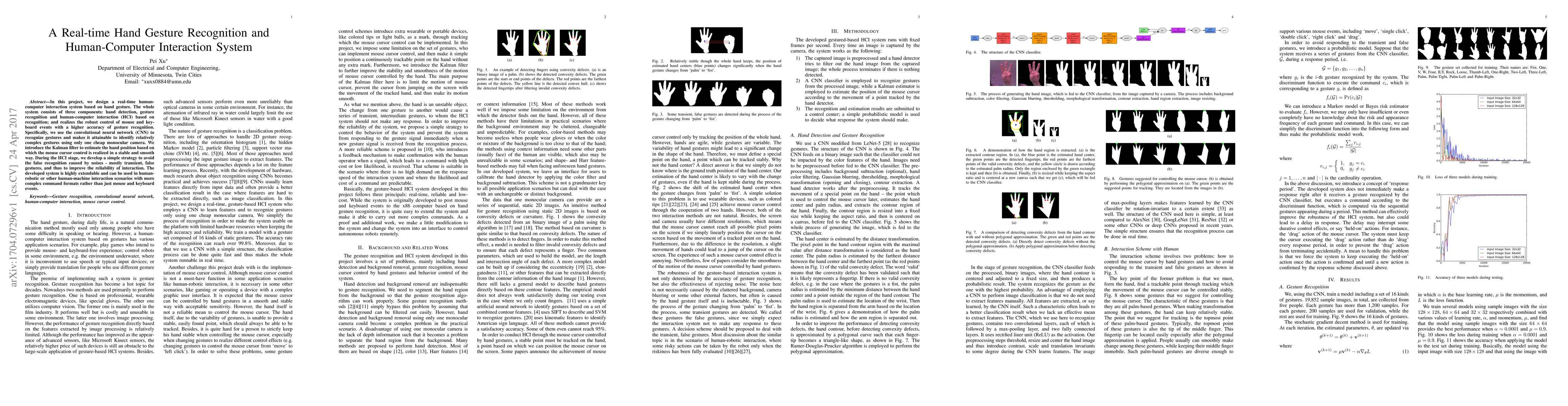 In this project, we design a real-time human-computer interaction system based on hand gesture. The whole system consists of three components: hand detection, gesture recognition and human-computer interaction (HCI) based on recognition; and realizes the robust control of mouse and keyboard events with a higher accuracy of gesture recognition. Specifically, we use the convolutional neural network (CNN) to recognize gestures and makes it attainable to identify relatively complex gestures using only one cheap monocular camera. We introduce the Kalman filter to estimate the hand position based on which the mouse cursor control is realized in a stable and smooth way. During the HCI stage, we develop a simple strategy to avoid the false recognition caused by noises - mostly transient, false gestures, and thus to improve the reliability of interaction. The developed system is highly extendable and can be used in human-robotic or other human-machine interaction scenarios with more complex command formats rather than just mouse and keyboard events.