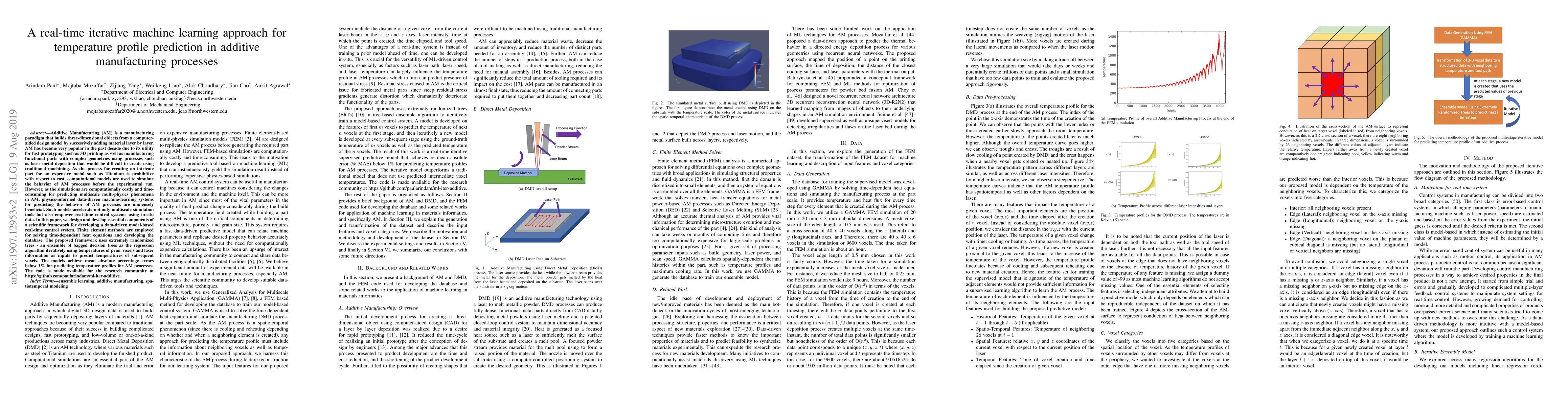 This paper develops a real-time iterative machine learning model using extremely randomized trees to predict temperature profiles in additive manufacturing processes, achieving mean absolute percentage errors below 1%. The framework integrates finite element methods and in-situ data for real-time control and simulation acceleration.