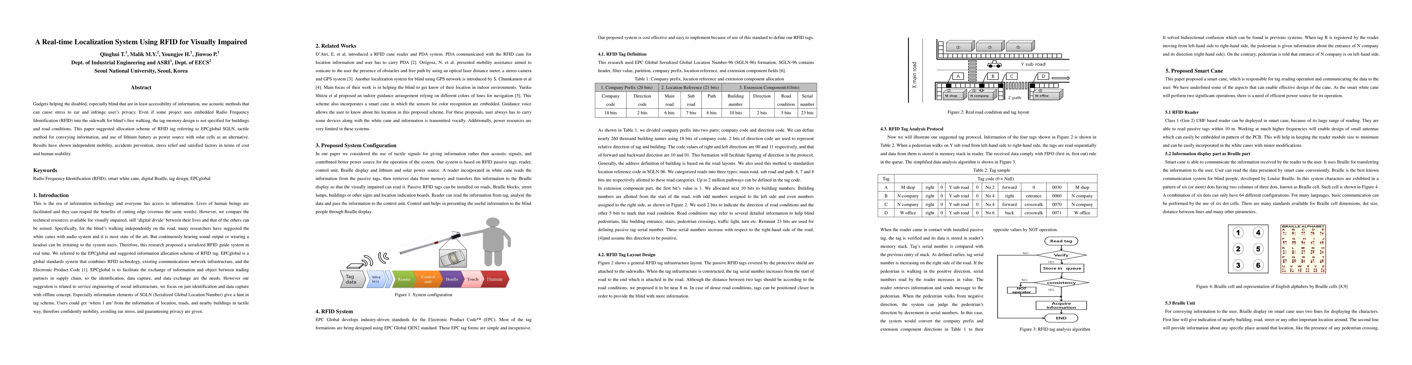 Gadgets helping the disabled, especially blind that are in least accessibility of information, use acoustic methods that can cause stress to ear and infringe user's privacy. Even if some project uses embedded Radio Frequency Identification (RFID) into the sidewalk for blind's free walking, the tag memory design is not specified for buildings and road conditions. This paper suggested allocation scheme of RFID tag referring to EPCglobal SGLN, tactile method for conveying information, and use of lithium battery as power source with solar cells as an alternative. Results have shown independent mobility, accidents prevention, stress relief and satisfied factors in terms of cost and human usability.