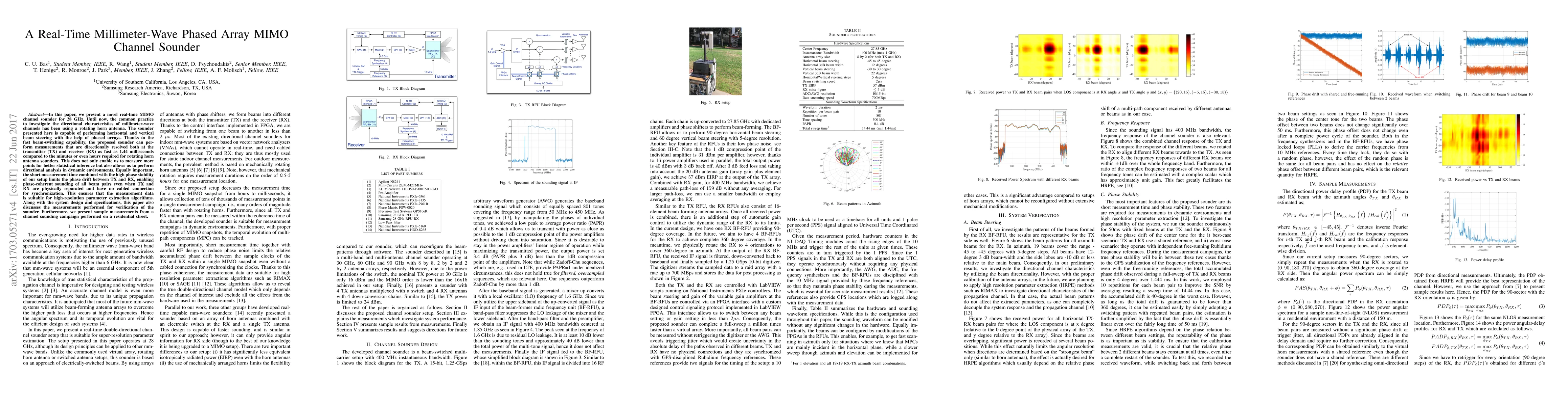 This paper introduces a real-time MIMO channel sounder operating at 28 GHz using millimeter-wave phased arrays, enabling rapid directional measurements in milliseconds compared to traditional rotating horn antennas. The sounder's fast beam-switching and high phase stability allow for dynamic environment analysis and phase-coherent sounding over separated transmitter and receiver units.