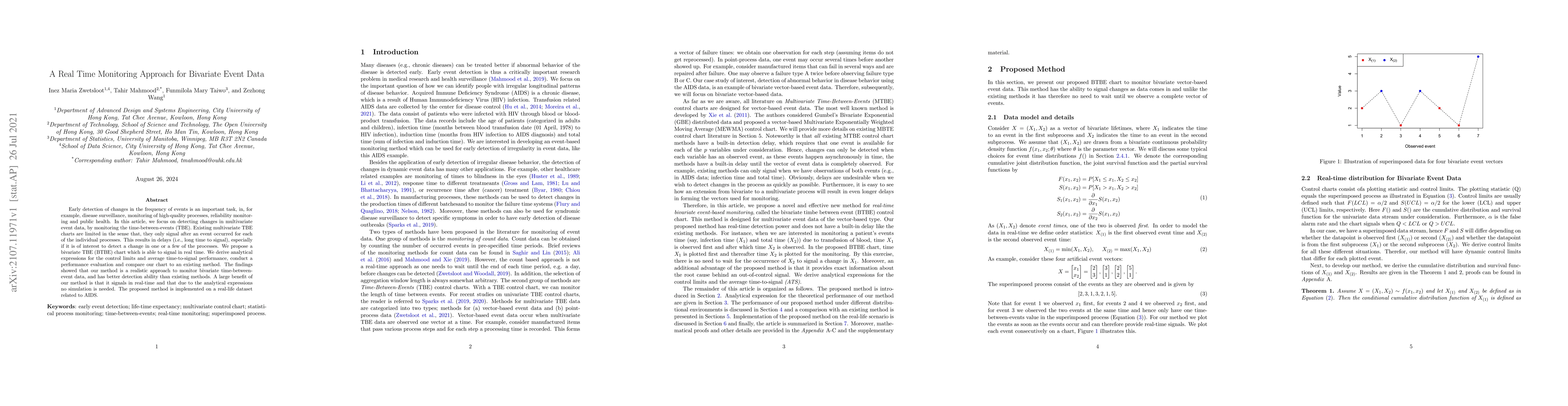 Early detection of changes in the frequency of events is an important task, in, for example, disease surveillance, monitoring of high-quality processes, reliability monitoring and public health. In this article, we focus on detecting changes in multivariate event data, by monitoring the time-between-events (TBE). Existing multivariate TBE charts are limited in the sense that, they only signal after an event occurred for each of the individual processes. This results in delays (i.e., long time to signal), especially if it is of interest to detect a change in one or a few of the processes. We propose a bivariate TBE (BTBE) chart which is able to signal in real time. We derive analytical expressions for the control limits and average time-to-signal performance, conduct a performance evaluation and compare our chart to an existing method. The findings showed that our method is a realistic approach to monitor bivariate time-between-event data, and has better detection ability than existing methods. A large benefit of our method is that it signals in real-time and that due to the analytical expressions no simulation is needed. The proposed method is implemented on a real-life dataset related to AIDS.