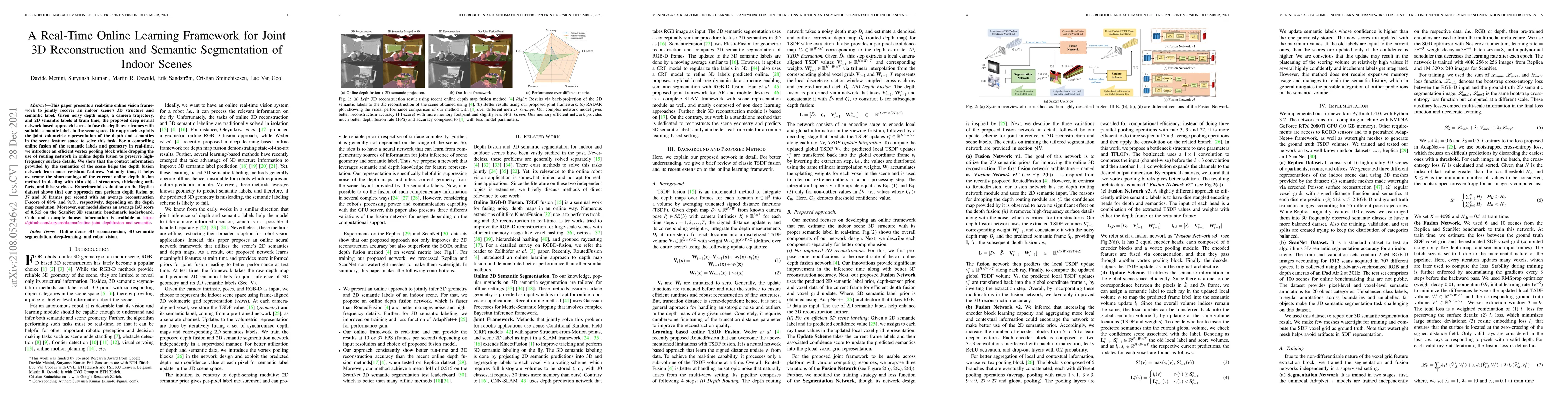 This paper proposes a real-time online learning framework for joint 3D reconstruction and semantic segmentation of indoor scenes, utilizing a deep neural network to fuse depth maps and semantic labels efficiently. The approach leverages context from semantic labels to improve noise-resistant feature learning and overcomes artifacts in depth fusion, achieving high performance on Replica and ScanNet datasets.