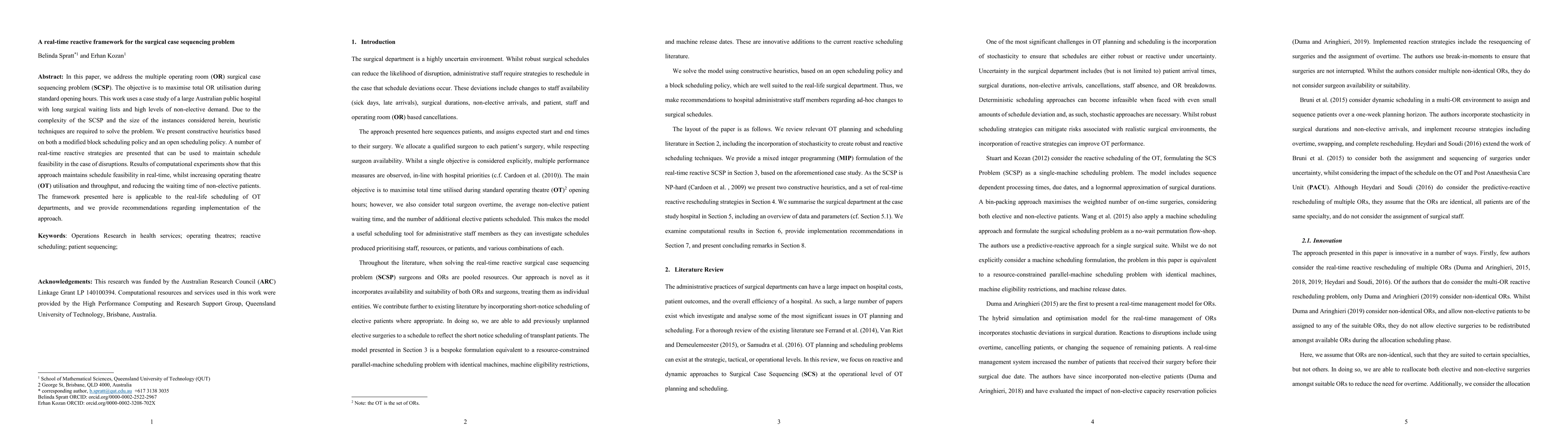 This paper proposes a real-time reactive framework for optimizing surgical case sequencing in operating rooms to maximize utilisation and reduce non-elective patient waiting times. The framework employs heuristic techniques and real-time strategies to maintain schedule feasibility amidst disruptions.
