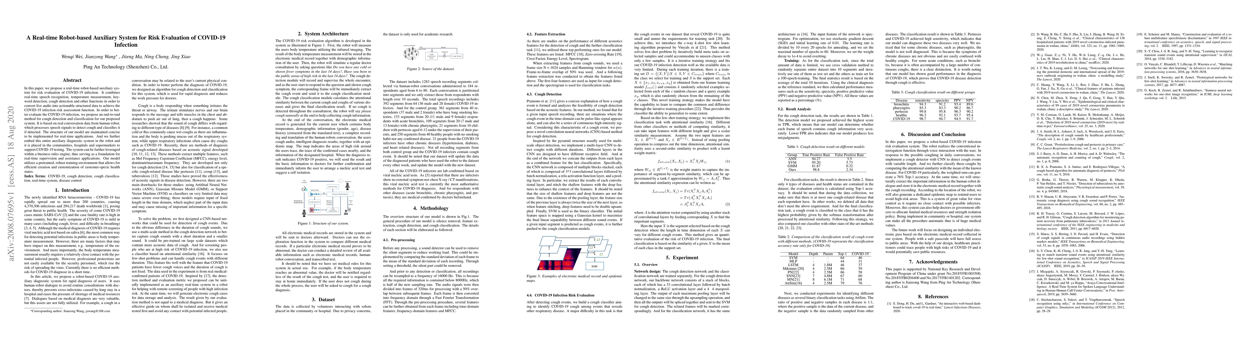 In this paper, we propose a real-time robot-based auxiliary system for risk evaluation of COVID-19 infection. It combines real-time speech recognition, temperature measurement, keyword detection, cough detection and other functions in order to convert live audio into actionable structured data to achieve the COVID-19 infection risk assessment function. In order to better evaluate the COVID-19 infection, we propose an end-to-end method for cough detection and classification for our proposed system. It is based on real conversation data from human-robot, which processes speech signals to detect cough and classifies it if detected. The structure of our model are maintained concise to be implemented for real-time applications. And we further embed this entire auxiliary diagnostic system in the robot and it is placed in the communities, hospitals and supermarkets to support COVID-19 testing. The system can be further leveraged within a business rules engine, thus serving as a foundation for real-time supervision and assistance applications. Our model utilizes a pretrained, robust training environment that allows for efficient creation and customization of customer-specific health states.
