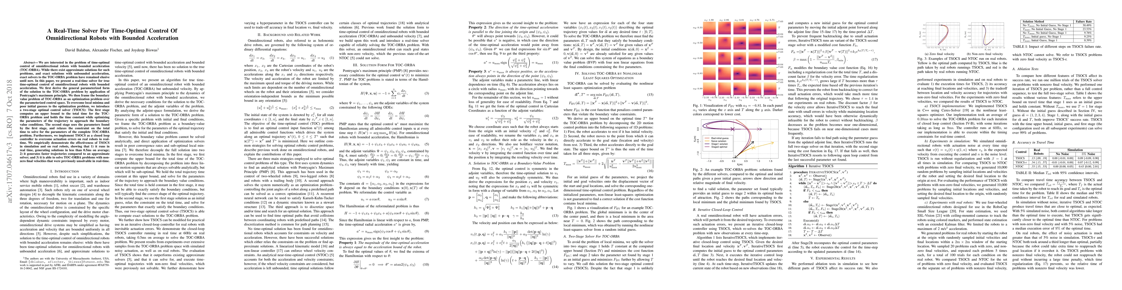 We are interested in the problem of time-optimal control of omnidirectional robots with bounded acceleration (TOC-ORBA). While there exist approximate solutions for such robots, and exact solutions with unbounded acceleration, exact solvers to the TOC-ORBA problem have remained elusive until now. In this paper, we present a real-time solver for true time-optimal control of omnidirectional robots with bounded acceleration. We first derive the general parameterized form of the solution to the TOC-ORBA problem by application of Pontryagin's maximum principle. We then frame the boundary value problem of TOC-ORBA as an optimization problem over the parametrized control space. To overcome local minima and poor initial guesses to the optimization problem, we introduce a two-stage optimal control solver (TSOCS): The first stage computes an upper bound to the total time for the TOC-ORBA problem and holds the time constant while optimizing the parameters of the trajectory to approach the boundary value conditions. The second stage uses the parameters found by the first stage, and relaxes the constraint on the total time to solve for the parameters of the complete TOC-ORBA problem. We further implement TSOCS as a closed loop controller to overcome actuation errors on real robots in real-time. We empirically demonstrate the effectiveness of TSOCS in simulation and on real robots, showing that 1) it runs in real time, generating solutions in less than 0.5ms on average; 2) it generates faster trajectories compared to an approximate solver; and 3) it is able to solve TOC-ORBA problems with non-zero final velocities that were previously unsolvable in real-time.