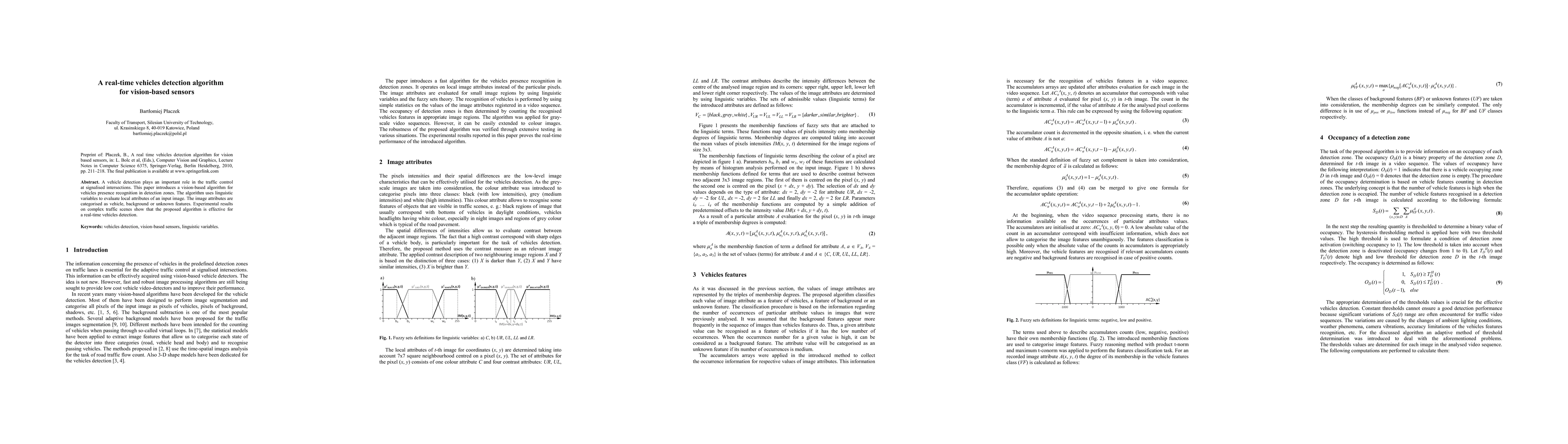 This paper presents a real-time vehicle detection algorithm using vision-based sensors, employing linguistic variables to categorize image attributes as vehicles, background, or unknown features, demonstrating effectiveness in complex traffic scenes.
