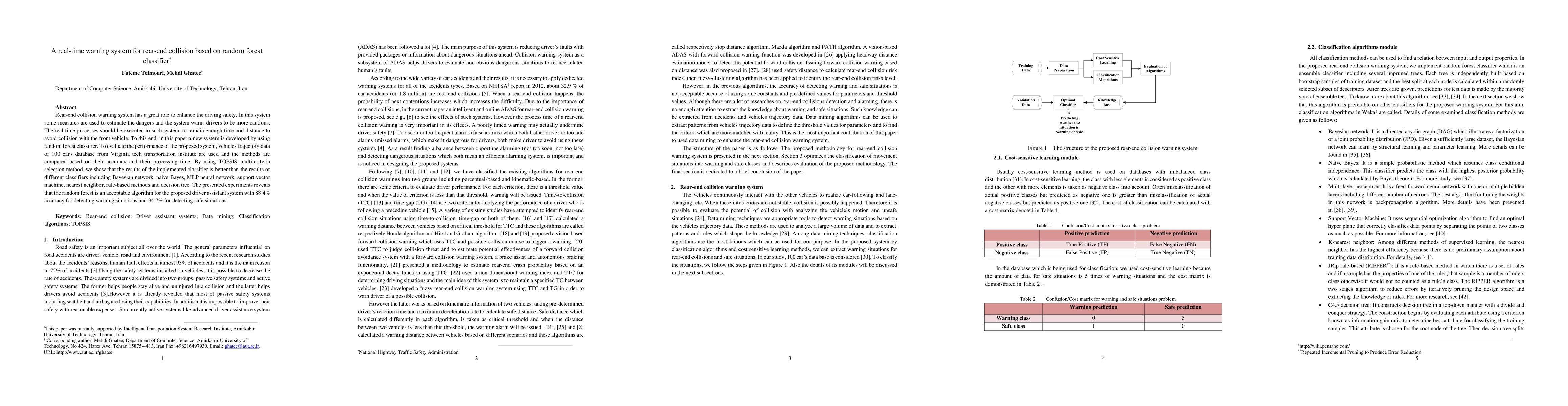 This paper develops a real-time rear-end collision warning system using a random forest classifier, achieving 88.4% accuracy in detecting dangerous situations and 94.7% in identifying safe conditions. Comparative analysis using TOPSIS shows superior performance over other classifiers like Bayesian networks and neural networks.