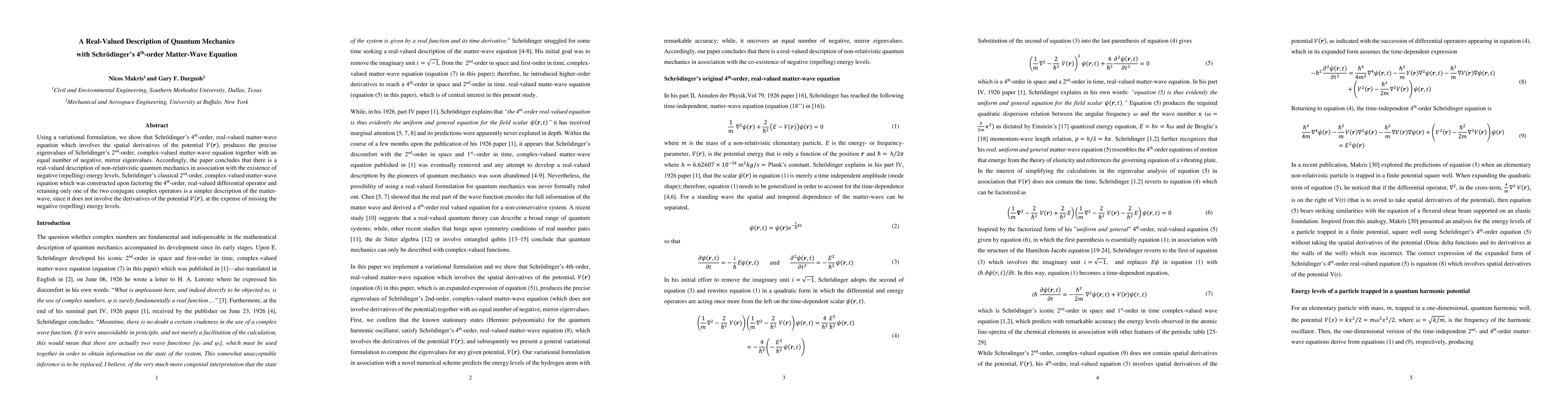 The paper presents a real-valued 4th-order matter-wave equation by Schrödinger that yields the same eigenvalues as the conventional 2nd-order complex-valued version, alongside an equal number of negative mirror eigenvalues, indicating a real-valued description of quantum mechanics with negative energy states. The traditional complex-valued equation simplifies the description by ignoring potential derivatives but omits these negative energy levels.