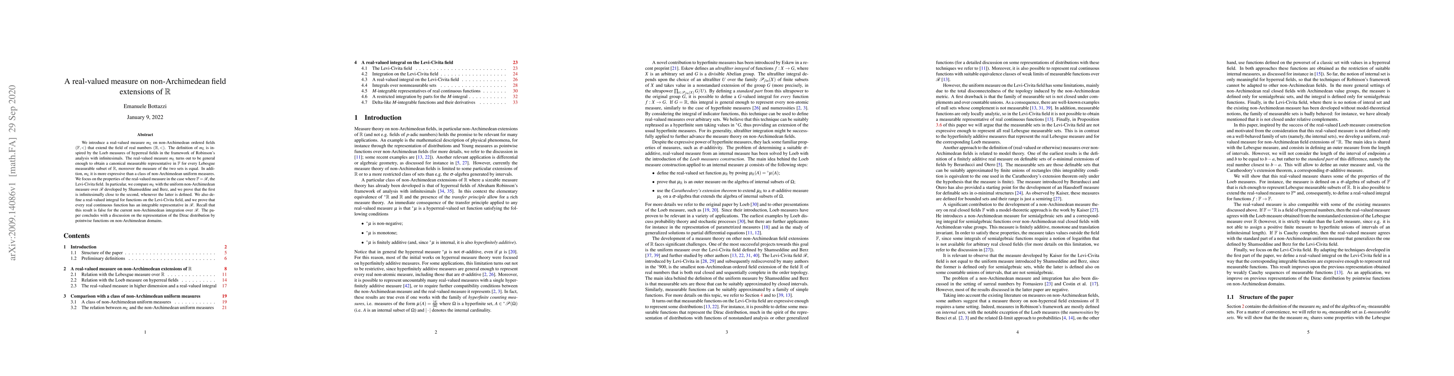 This paper introduces a real-valued measure ${m_L}$ on non-Archimedean ordered fields extending $\mathbb{R}$, inspired by Loeb measures, and proves it is more expressive than uniform measures. It focuses on the Levi-Civita field $\mathcal{R}$, showing ${m_L}$ is infinitesimally close to the uniform measure and enabling the integration of real continuous functions.