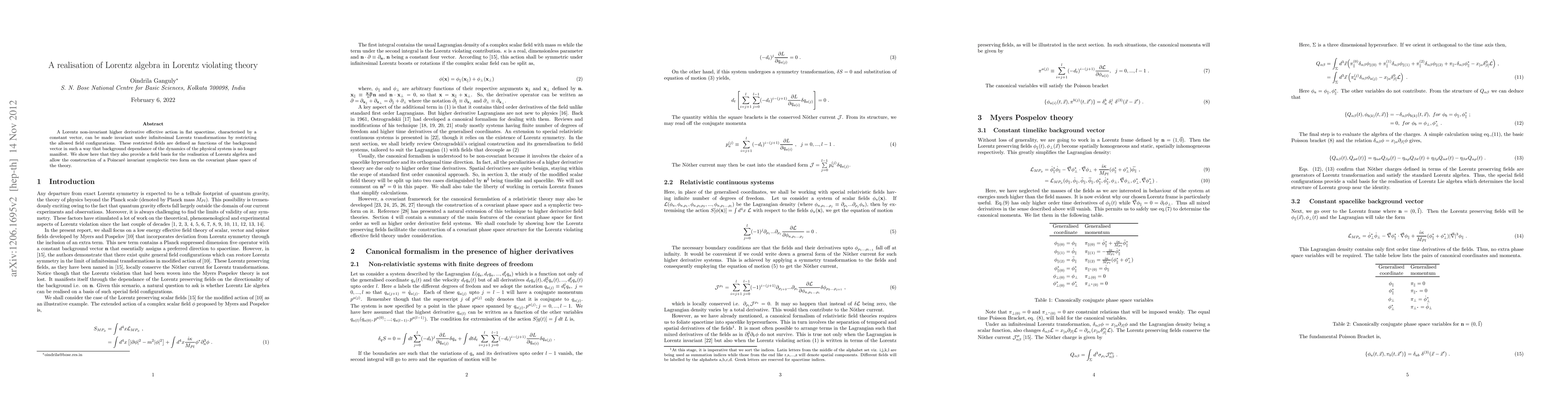 A Lorentz non-invariant higher derivative effective action in flat spacetime, characterised by a constant vector, can be made invariant under infinitesimal Lorentz transformations by restricting the allowed field configurations. These restricted fields are defined as functions of the background vector in such a way that background dependance of the dynamics of the physical system is no longer manifest. We show here that they also provide a field basis for the realisation of Lorentz algebra and allow the construction of a Poincar\'e invariant symplectic two form on the covariant phase space of the theory.