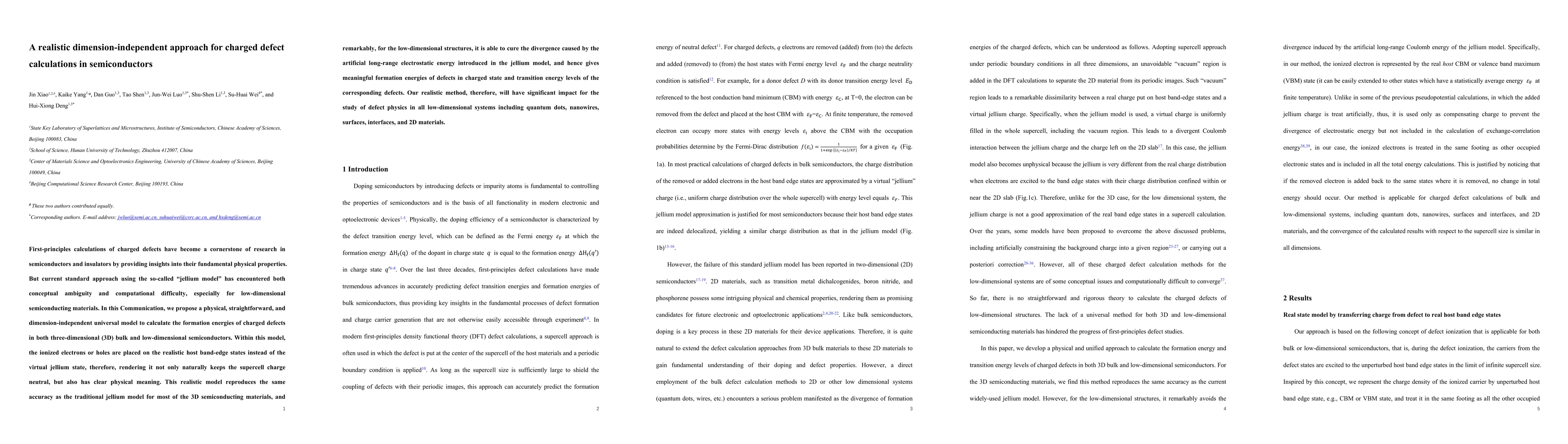 This paper proposes a new dimension-independent model for calculating charged defect formation energies in semiconductors, replacing the ambiguous jellium model with a realistic approach that places ionized carriers on host band-edge states, providing accurate and meaningful results for both 3D and low-dimensional semiconducting materials.