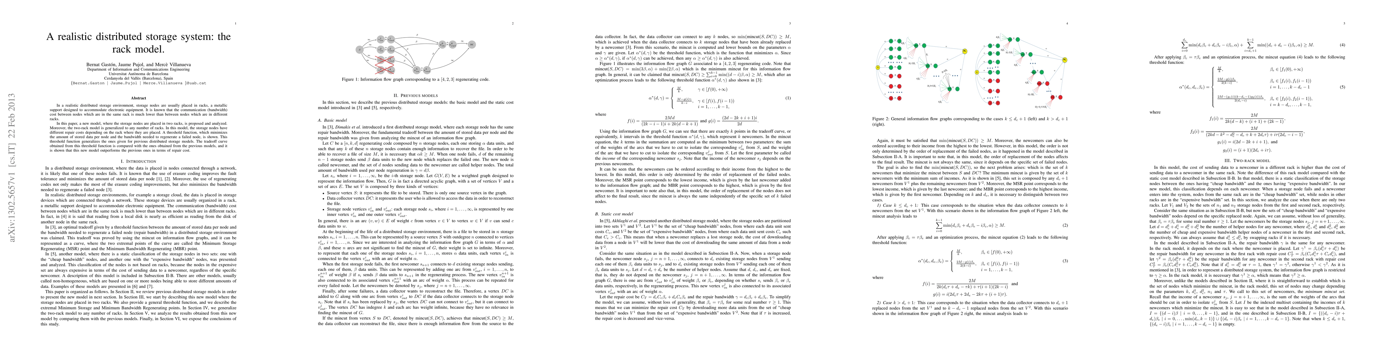 In a realistic distributed storage environment, storage nodes are usually placed in racks, a metallic support designed to accommodate electronic equipment. It is known that the communication (bandwidth) cost between nodes which are in the same rack is much lower than between nodes which are in different racks. In this paper, a new model, where the storage nodes are placed in two racks, is proposed and analyzed. Moreover, the two-rack model is generalized to any number of racks. In this model, the storage nodes have different repair costs depending on the rack where they are placed. A threshold function, which minimizes the amount of stored data per node and the bandwidth needed to regenerate a failed node, is shown. This threshold function generalizes the ones given for previous distributed storage models. The tradeoff curve obtained from this threshold function is compared with the ones obtained from the previous models, and it is shown that this new model outperforms the previous ones in terms of repair cost.