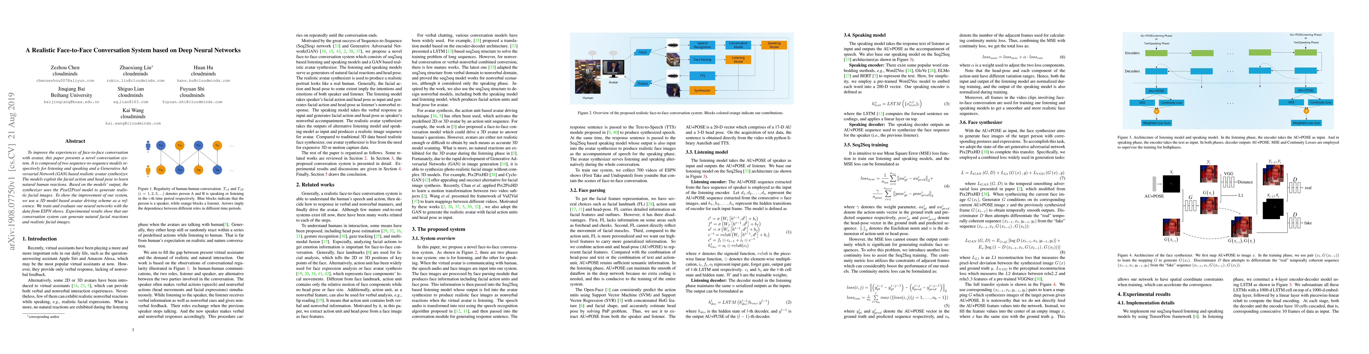 This paper introduces a face-to-face conversation system using deep neural networks, comprising sequence-to-sequence models for listening and speaking, and a GAN-based avatar synthesizer. The system generates realistic facial reactions and images, demonstrated through experiments using ESPN show data.