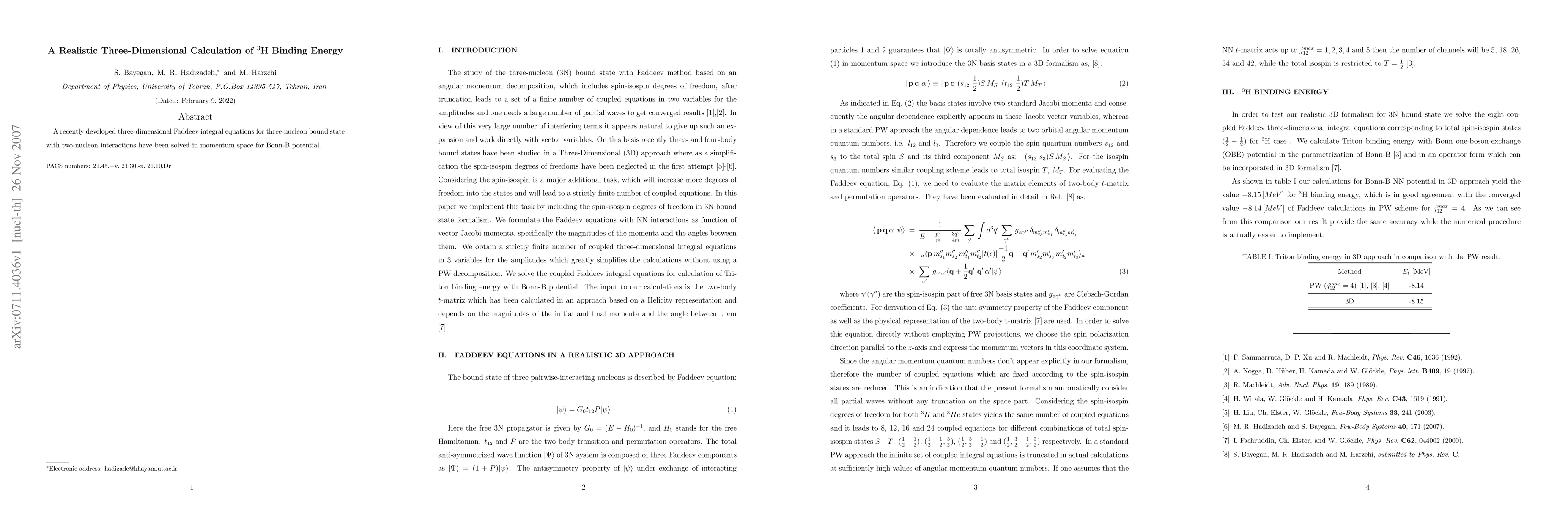 This research solves three-dimensional Faddeev integral equations for a three-nucleon bound state using the Bonn-B potential in momentum space, focusing on calculating the 3H binding energy realistically.