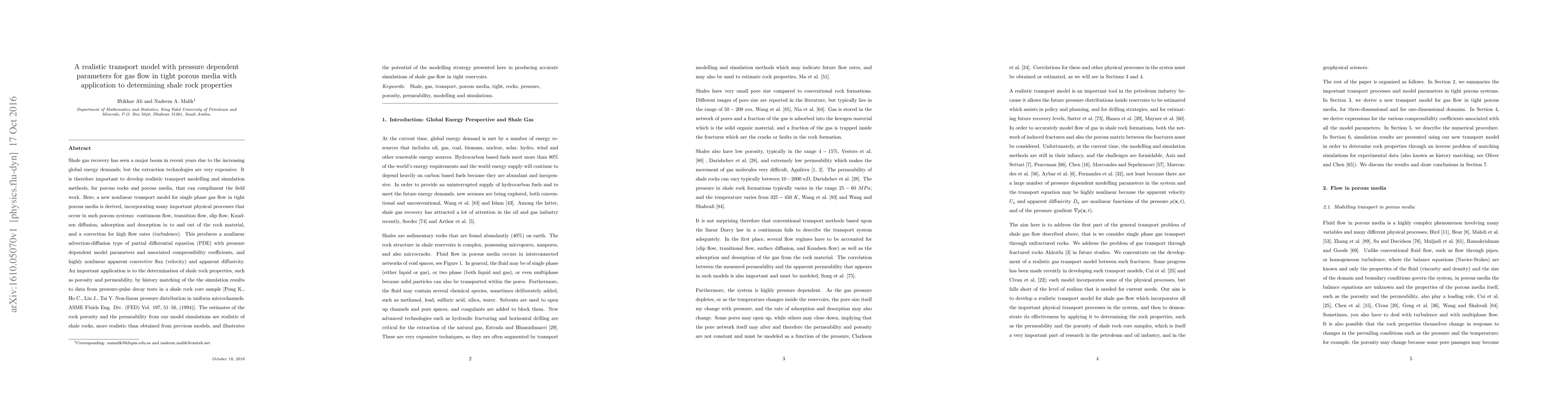This paper presents a new nonlinear transport model for gas flow in tight porous media, incorporating various physical processes like slip flow and Knudsen diffusion. The model's pressure-dependent parameters enable accurate simulations of shale gas flow, providing more realistic estimates of shale rock properties like porosity and permeability compared to previous models.