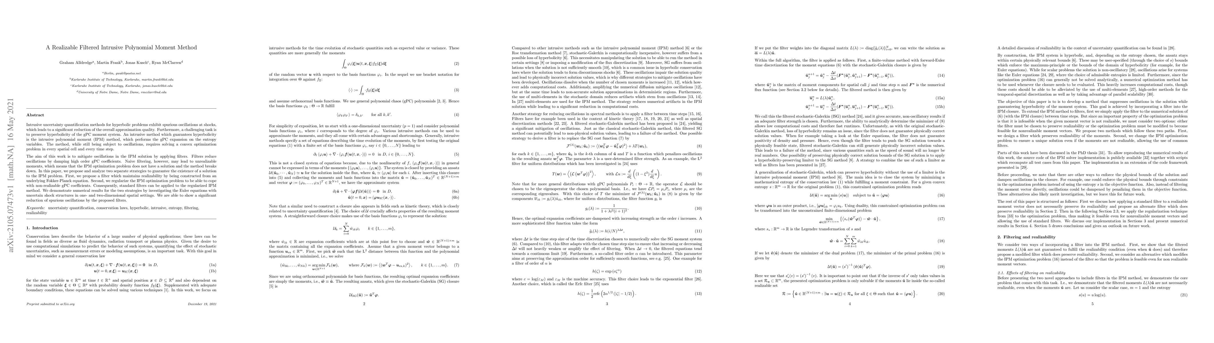 Intrusive uncertainty quantification methods for hyperbolic problems exhibit spurious oscillations at shocks, which leads to a significant reduction of the overall approximation quality. Furthermore, a challenging task is to preserve hyperbolicity of the gPC moment system. An intrusive method which guarantees hyperbolicity is the intrusive polynomial moment (IPM) method, which performs the gPC expansion on the entropy variables. The method, while still being subject to oscillations, requires solving a convex optimization problem in every spatial cell and every time step. The aim of this work is to mitigate oscillations in the IPM solution by applying filters. Filters reduce oscillations by damping high order gPC coefficients. Naive filtering, however, may lead to unrealizable moments, which means that the IPM optimization problem does not have a solution and the method breaks down. In this paper, we propose and analyze two separate strategies to guarantee the existence of a solution to the IPM problem. First, we propose a filter which maintains realizability by being constructed from an underlying Fokker-Planck equation. Second, we regularize the IPM optimization problem to be able to cope with non-realizable gPC coefficients. Consequently, standard filters can be applied to the regularized IPM method. We demonstrate numerical results for the two strategies by investigating the Euler equations with uncertain shock structures in one- and two-dimensional spatial settings. We are able to show a significant reduction of spurious oscillations by the proposed filters.