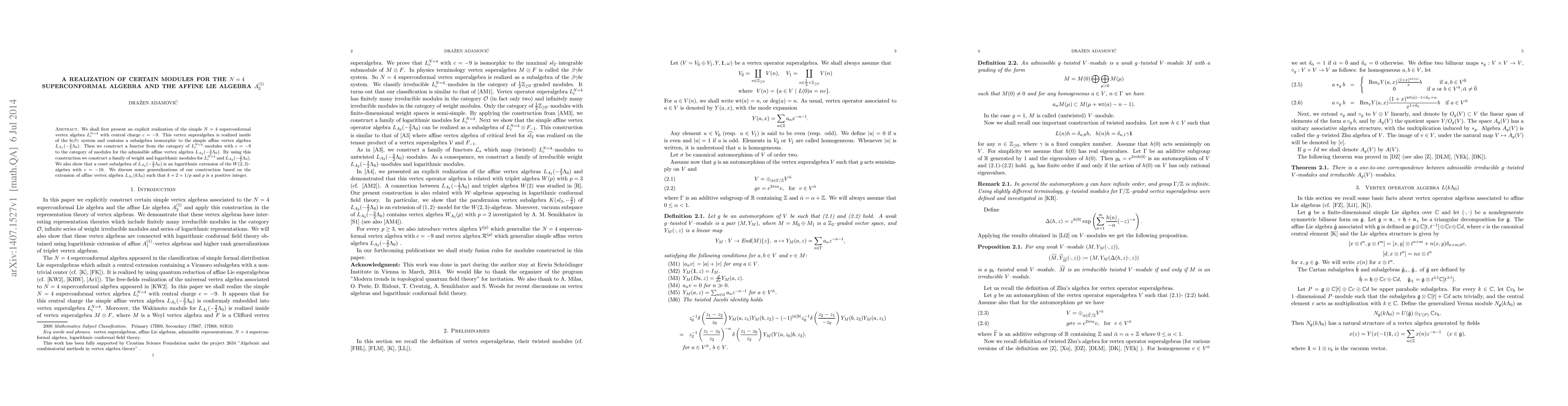 We shall first present an explicit realization of the simple $N=4$ superconformal vertex algebra $L_{c} ^{N=4}$ with central charge $c=-9$. This vertex superalgebra is realized inside of the $ b c \beta \gamma $ system and contains a subalgebra isomorphic to the simple affine vertex algebra $L_{A_1} (- \tfrac{3}{2} \Lambda_0)$. Then we construct a functor from the category of $L_{c} ^{N=4}$--modules with $c=-9$ to the category of modules for the admissible affine vertex algebra $L_{A_{2} } (-\tfrac{3}{2} \Lambda_0)$. By using this construction we construct a family of weight and logarithmic modules for $L_{c} ^{N=4}$ and $L_{A_{2} } (-\tfrac{3}{2} \Lambda_0)$. We also show that a coset subalgebra of $L_{A_{2} } (-\tfrac{3}{2} \Lambda_0)$ is an logarithmic extension of the $W(2,3)$--algebra with $c=-10$. We discuss some generalizations of our construction based on the extension of affine vertex algebra $L_{A_1} (k \Lambda_0)$ such that $k+2 = 1/p$ and $p$ is a positive integer.