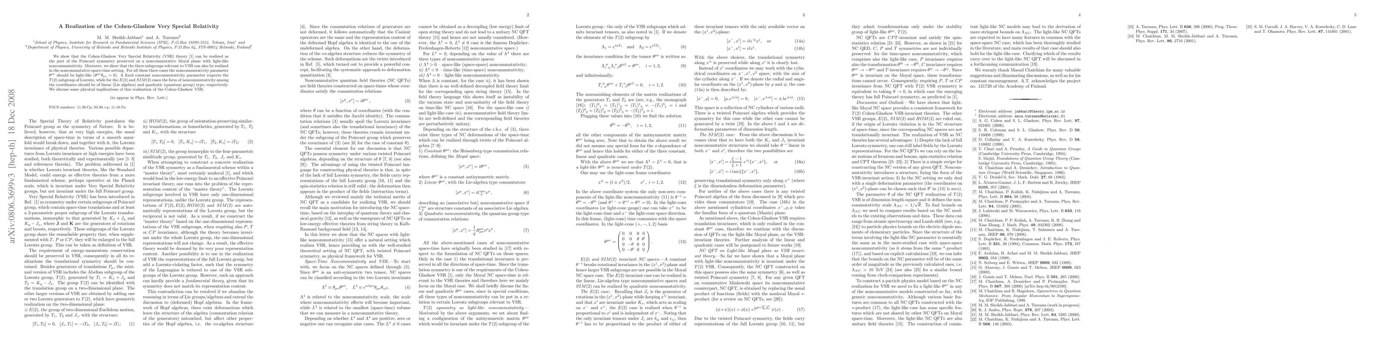 We show that the Cohen-Glashow Very Special Relativity (VSR) theory [1] can be realized as the part of the Poincar\'e symmetry preserved on a noncommutative Moyal plane with light-like noncommutativity. Moreover, we show that the three subgroups relevant to the Cohen-Glashow VSR can also be realized in the noncommutative space-time setting. For all these three cases the noncommutativity parameter $\theta^{\mu\nu}$ should be light-like ($\theta^{\mu\nu}\theta_{\mu\nu}=0$). A fixed constant noncommutativity parameter respects the T(2) subgroup of Lorentz, while for the E(2) and SIM(2) cases the form of noncommutativity among the coordinates should be of linear (Lie algebra) and quadratic (quantum group) type, respectively. We discuss some physical implications of this realization of the Cohen-Glashow VSR.