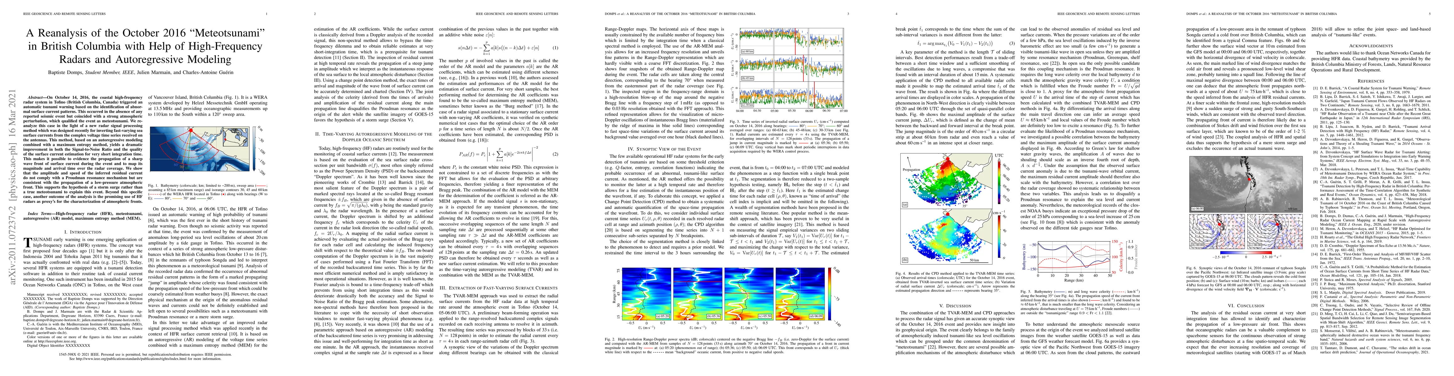 The paper reanalyzes the 2016 Tofino meteotsunami event using advanced radar signal processing. It introduces a new method combining autoregressive modeling and Maximum Entropy Method, enhancing current estimation. The analysis reveals the event was likely a storm surge, not a meteotsunami, as its characteristics align with atmospheric front propagation rather than Proudman resonance. The study also highlights the potential of oceanographic radars for characterizing atmospheric fronts.