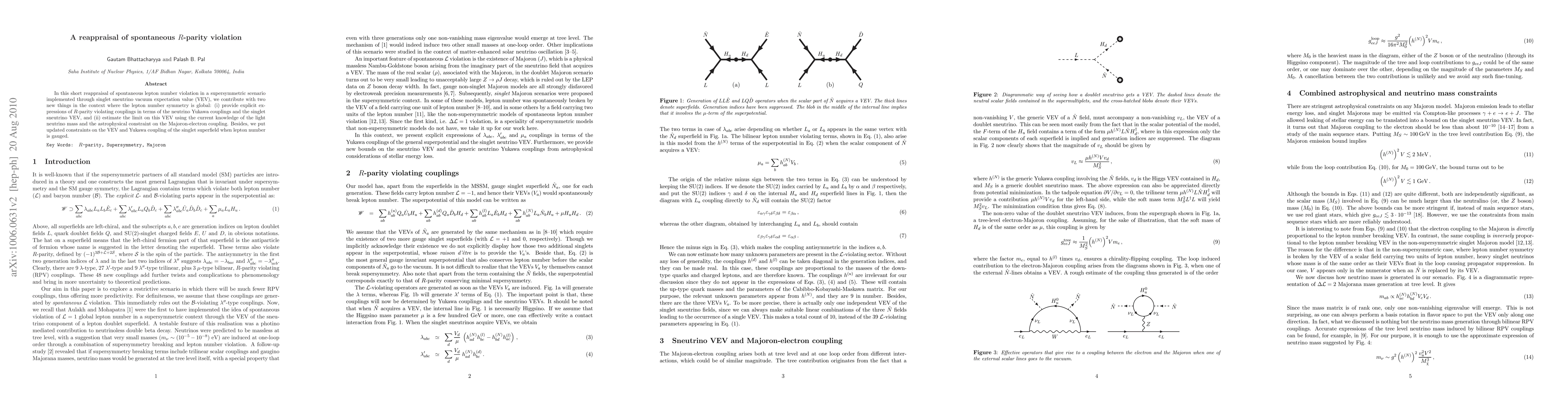 This paper reexamines spontaneous lepton number violation in supersymmetric models via singlet sneutrino vacuum expectation values, providing explicit $R$-parity violating couplings and estimating the limit on the VEV using current neutrino mass and astrophysical constraints. It also updates constraints on the VEV and Yukawa coupling when lepton number is gauged.