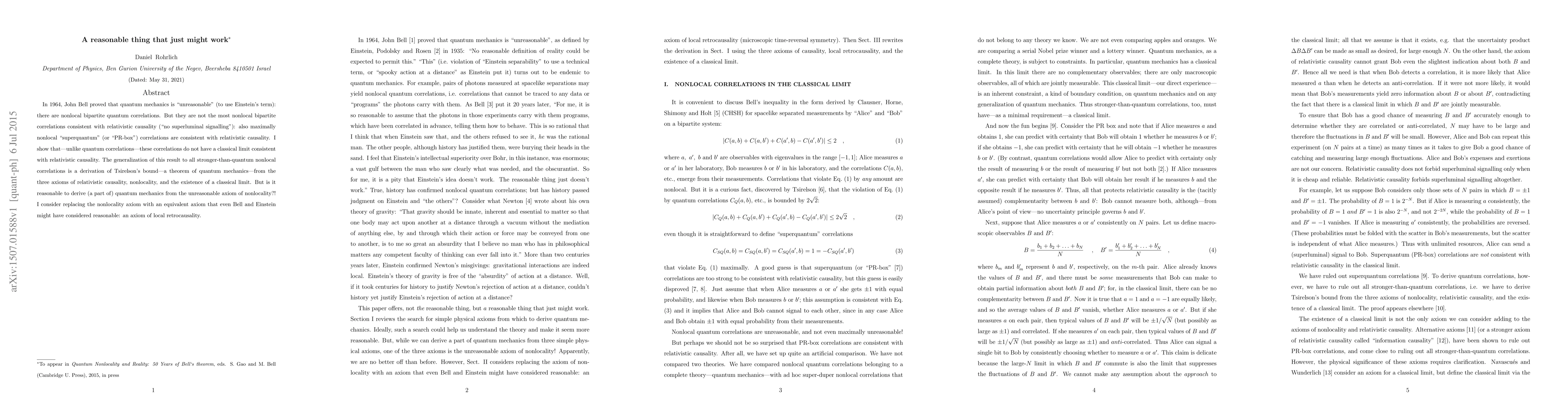 In 1964, John Bell proved that quantum mechanics is "unreasonable" (to use Einstein's term): there are nonlocal bipartite quantum correlations. But they are not the most nonlocal bipartite correlations consistent with relativistic causality ("no superluminal signalling"): also maximally nonlocal "superquantum" (or "PR-box") correlations are consistent with relativistic causality. I show that---unlike quantum correlations---these correlations do not have a classical limit consistent with relativistic causality. The generalization of this result to all stronger-than-quantum nonlocal correlations is a derivation of Tsirelson's bound---a theorem of quantum mechanics---from the three axioms of relativistic causality, nonlocality, and the existence of a classical limit. But is it reasonable to derive (a part of) quantum mechanics from the unreasonable axiom of nonlocality?! I consider replacing the nonlocality axiom with an equivalent axiom that even Bell and Einstein might have considered reasonable: an axiom of local retrocausality.