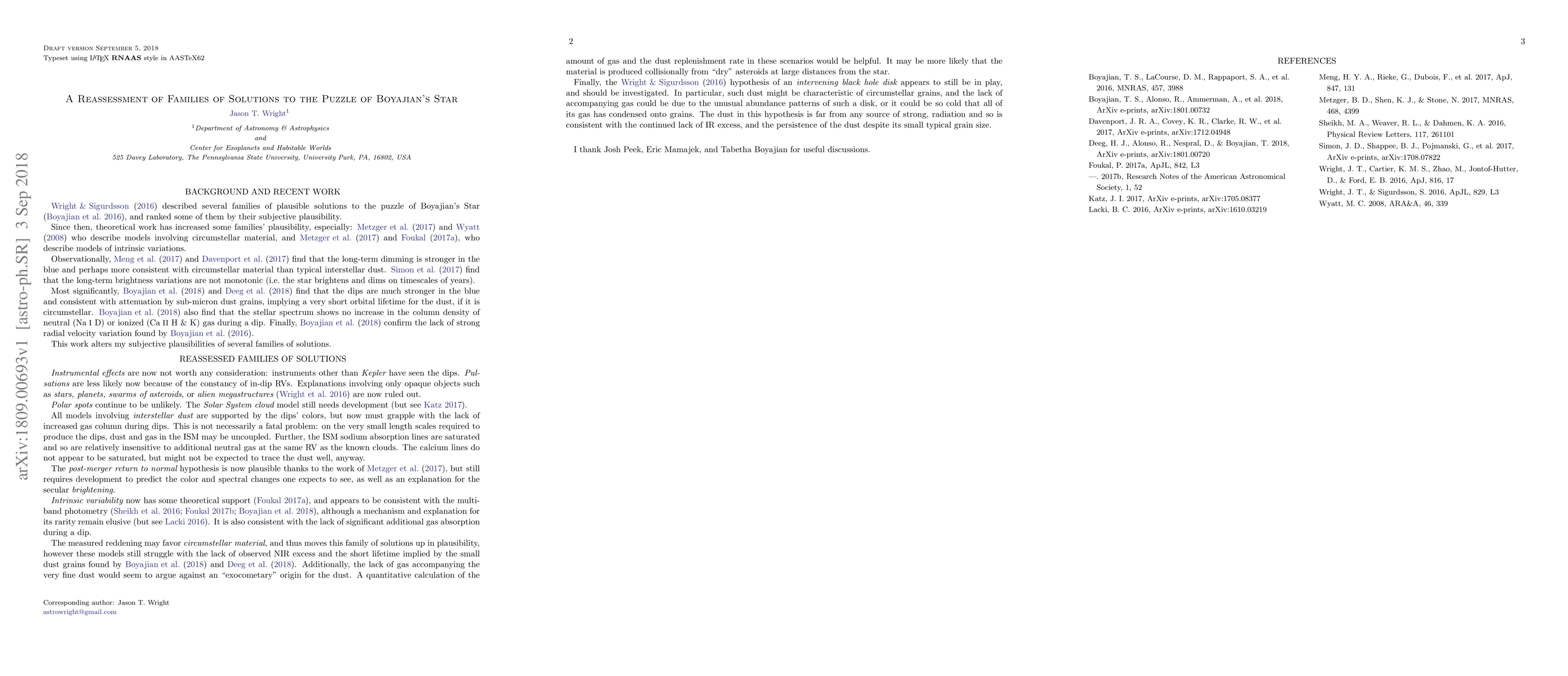 Wright & Sigurdsson (2016) described several families of plausible solutions to the puzzle of Boyajian's Star (Boyajian et al. 2016), and ranked some of them by their subjective plausibility. Since then, theoretical and observational work have altered many families' plausibility, and so in this Research Note I reassess them, including the possibilities of intrinsic variation, intervening ISM or circum-black hole material, and circumstellar material such as exocomets.
