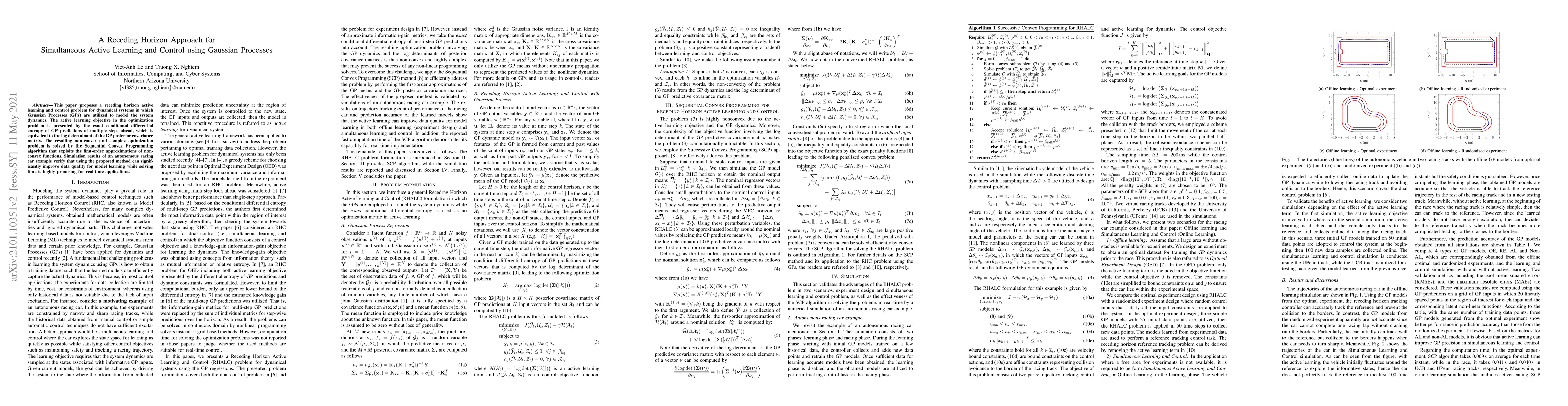 This paper proposes a receding horizon active learning and control problem for dynamical systems in which Gaussian Processes (GPs) are utilized to model the system dynamics. The active learning objective in the optimization problem is presented by the exact conditional differential entropy of GP predictions at multiple steps ahead, which is equivalent to the log determinant of the GP posterior covariance matrix. The resulting non-convex and complex optimization problem is solved by the Sequential Convex Programming algorithm that exploits the first-order approximations of non-convex functions. Simulation results of an autonomous racing car example verify that using the proposed method can significantly improve data quality for model learning while solving time is highly promising for real-time applications.