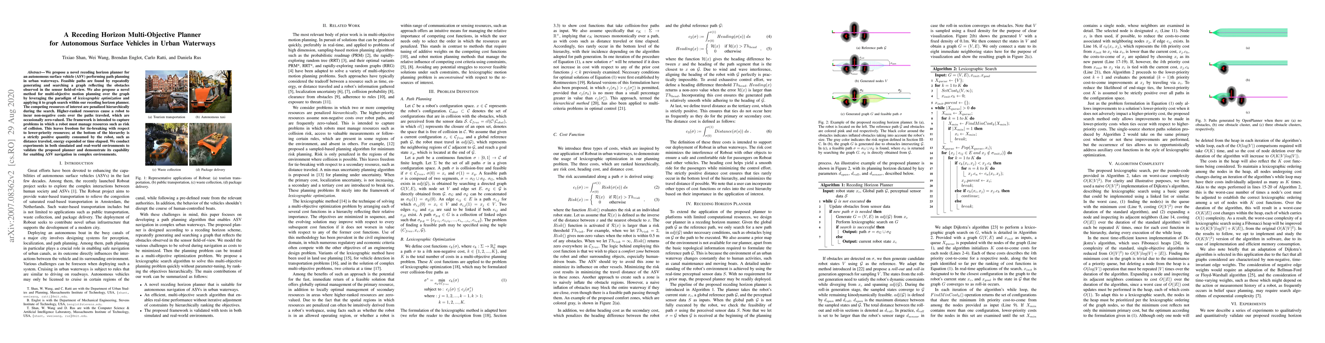 We propose a novel receding horizon planner for an autonomous surface vehicle (ASV) performing path planning in urban waterways. Feasible paths are found by repeatedly generating and searching a graph reflecting the obstacles observed in the sensor field-of-view. We also propose a novel method for multi-objective motion planning over the graph by leveraging the paradigm of lexicographic optimization and applying it to graph search within our receding horizon planner. The competing resources of interest are penalized hierarchically during the search. Higher-ranked resources cause a robot to incur non-negative costs over the paths traveled, which are occasionally zero-valued. The framework is intended to capture problems in which a robot must manage resources such as risk of collision. This leaves freedom for tie-breaking with respect to lower-priority resources; at the bottom of the hierarchy is a strictly positive quantity consumed by the robot, such as distance traveled, energy expended or time elapsed. We conduct experiments in both simulated and real-world environments to validate the proposed planner and demonstrate its capability for enabling ASV navigation in complex environments.