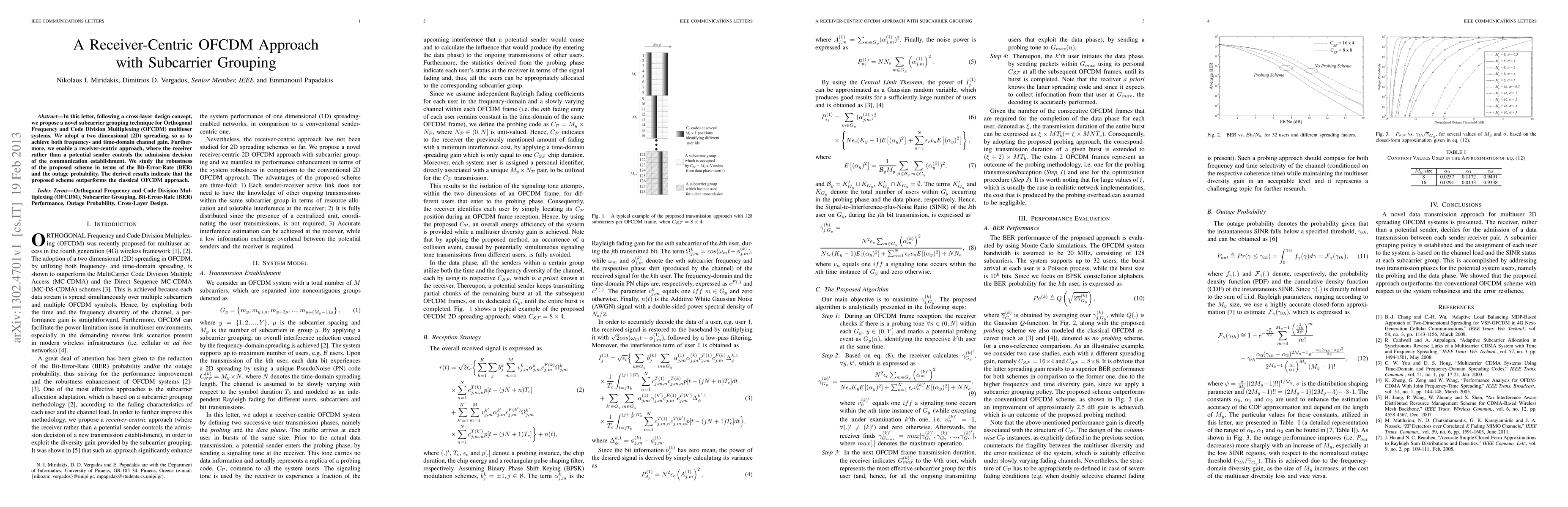 In this letter, following a cross-layer design concept, we propose a novel subcarrier grouping technique for Orthogonal Frequency and Code Division Multiplexing (OFCDM) multiuser systems. We adopt a two dimensional (2D) spreading, so as to achieve both frequency- and time-domain channel gain. Furthermore, we enable a receiver-centric approach, where the receiver rather than a potential sender controls the admission decision of the communication establishment. We study the robustness of the proposed scheme in terms of the Bit-Error-Rate (BER) and the outage probability. The derived results indicate that the proposed scheme outperforms the classical OFCDM approach.